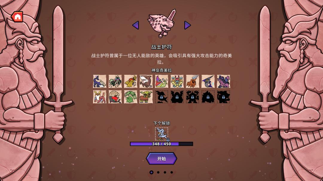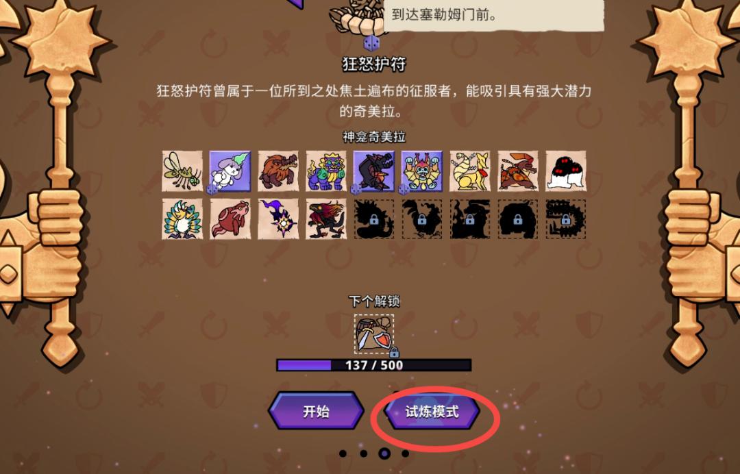 同樣和衆多肉鴿元素遊戲類似,本作也會通過反覆通過解鎖新內容,當你使用護符打通三張地圖後,系統會自動解鎖下一個護符,所有護符都解鎖後,系統會提供試煉模式,解鎖最終BOSS。