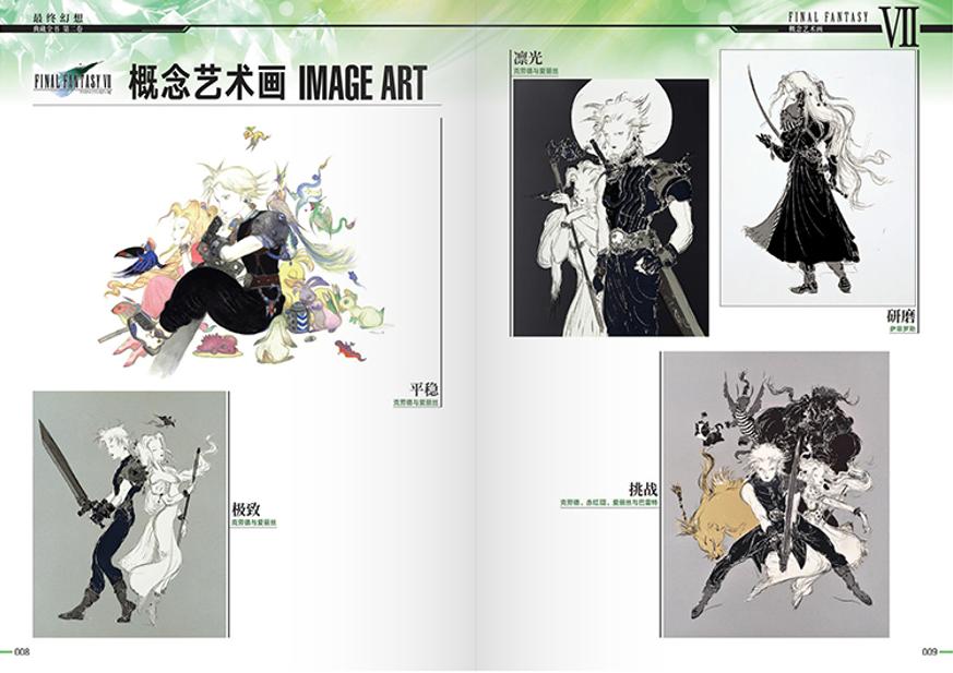 接下來會集中展示御用畫師天野喜孝繪製的角色和場景概念圖,你可以看到唯美浪漫的克勞德、蒂法和愛麗絲等人,與野村哲筆下的角色形成了極大反差。