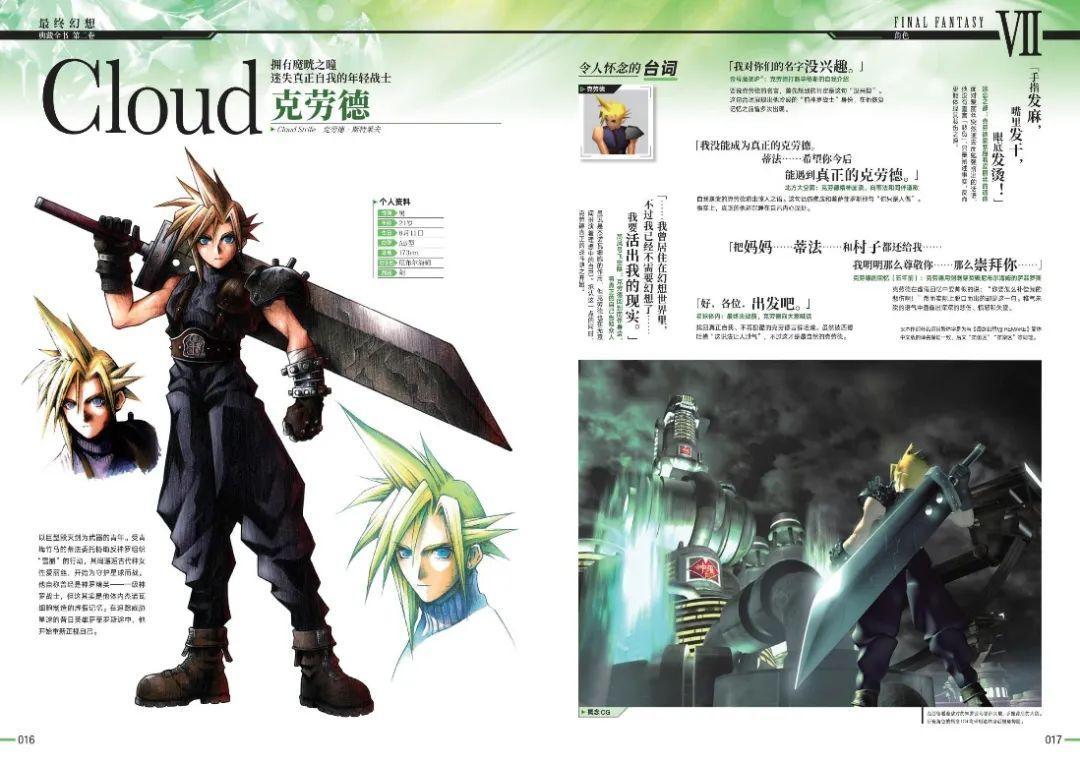 對於新玩家來說,故事和人物環節是瞭解這部作品的最好渠道。本書會先配合遊戲截圖梳理劇情內容,再一一介紹主要登場角色。以克勞德爲例,讀者可以看到他的個人簡介、原畫設定圖以及CG模型等。當然,也少不了一些名臺詞和名場面。