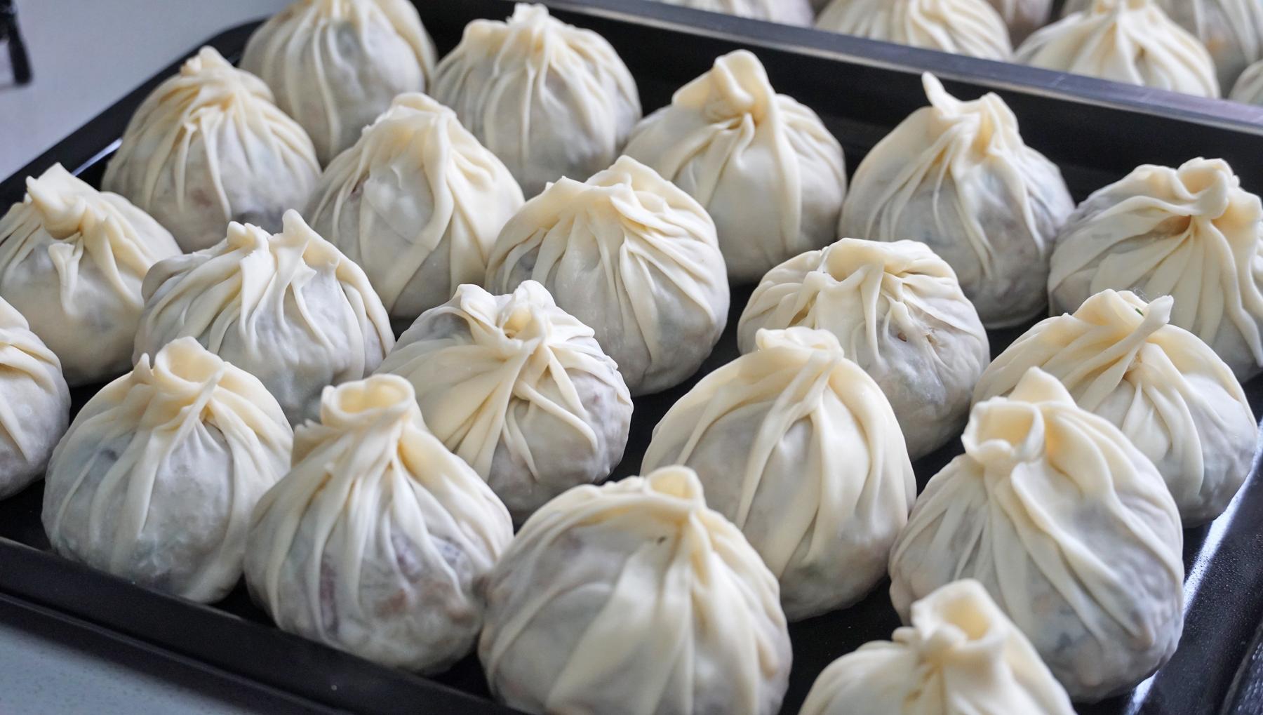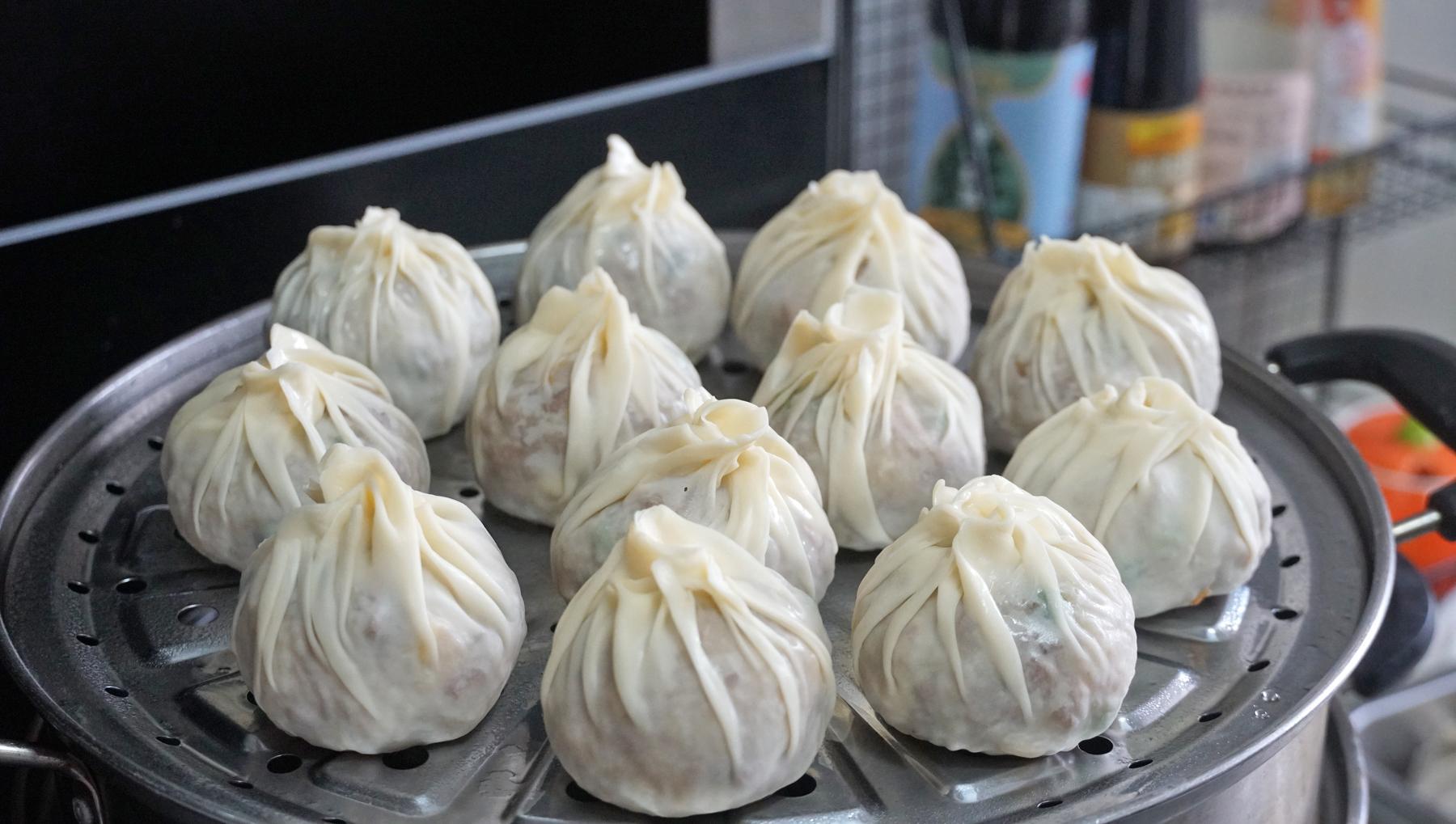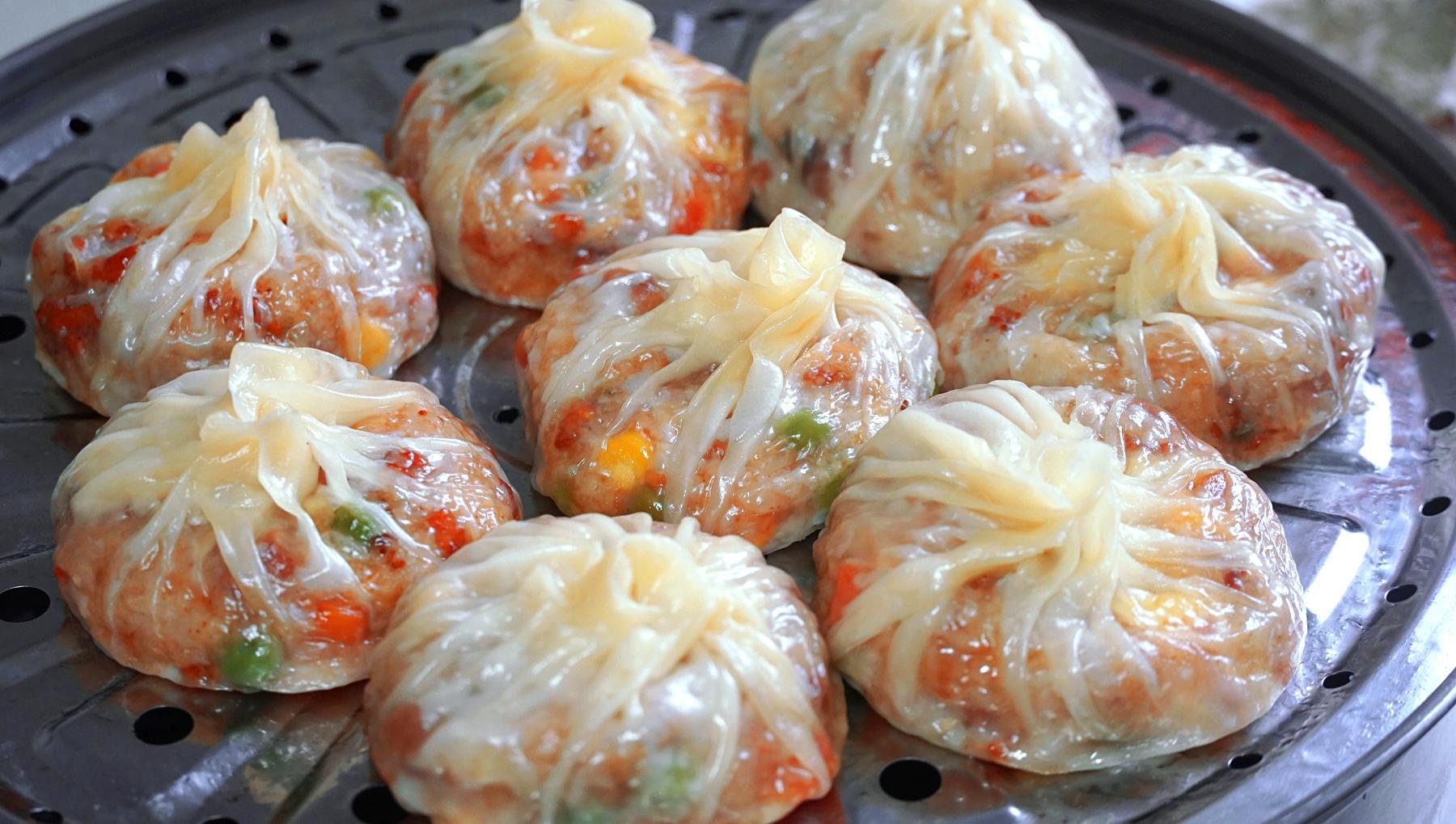 喫的時候拿出來直接蒸就行,鍋裏水開了就把燒麥加進來,表面噴點水保溼,蒸出來的燒麥皮就不會變硬了,大火蒸個10分鐘就夠了;