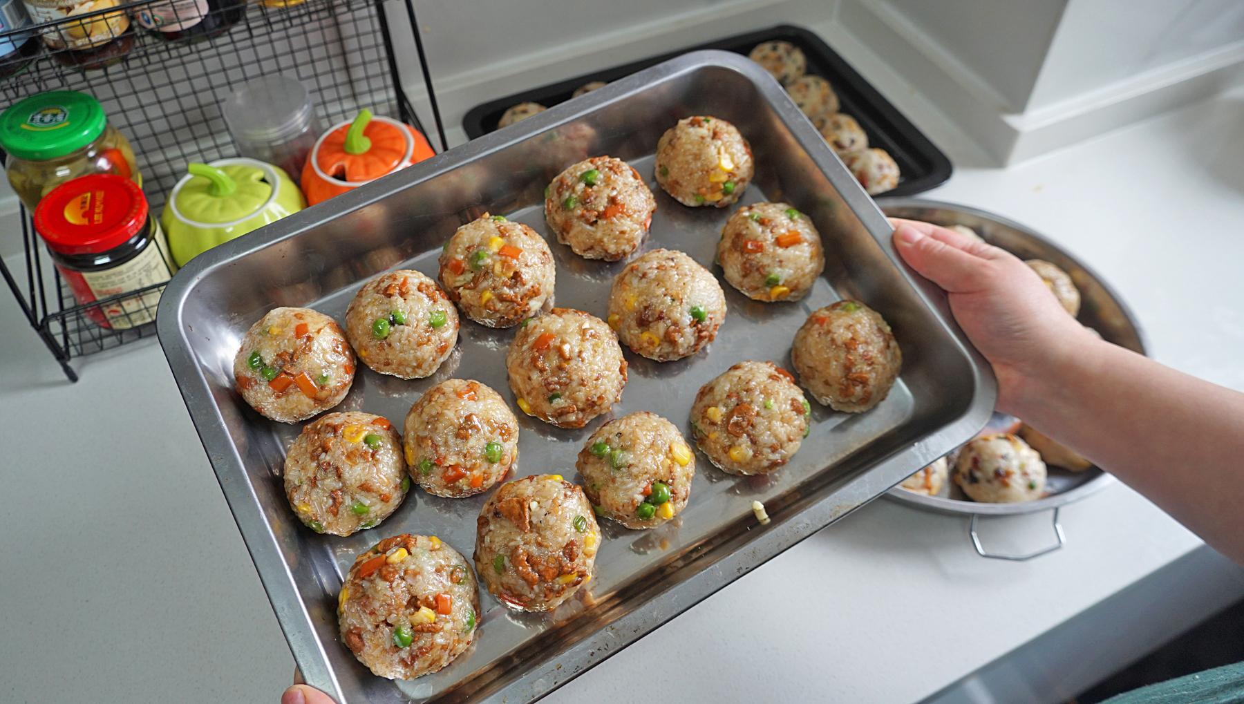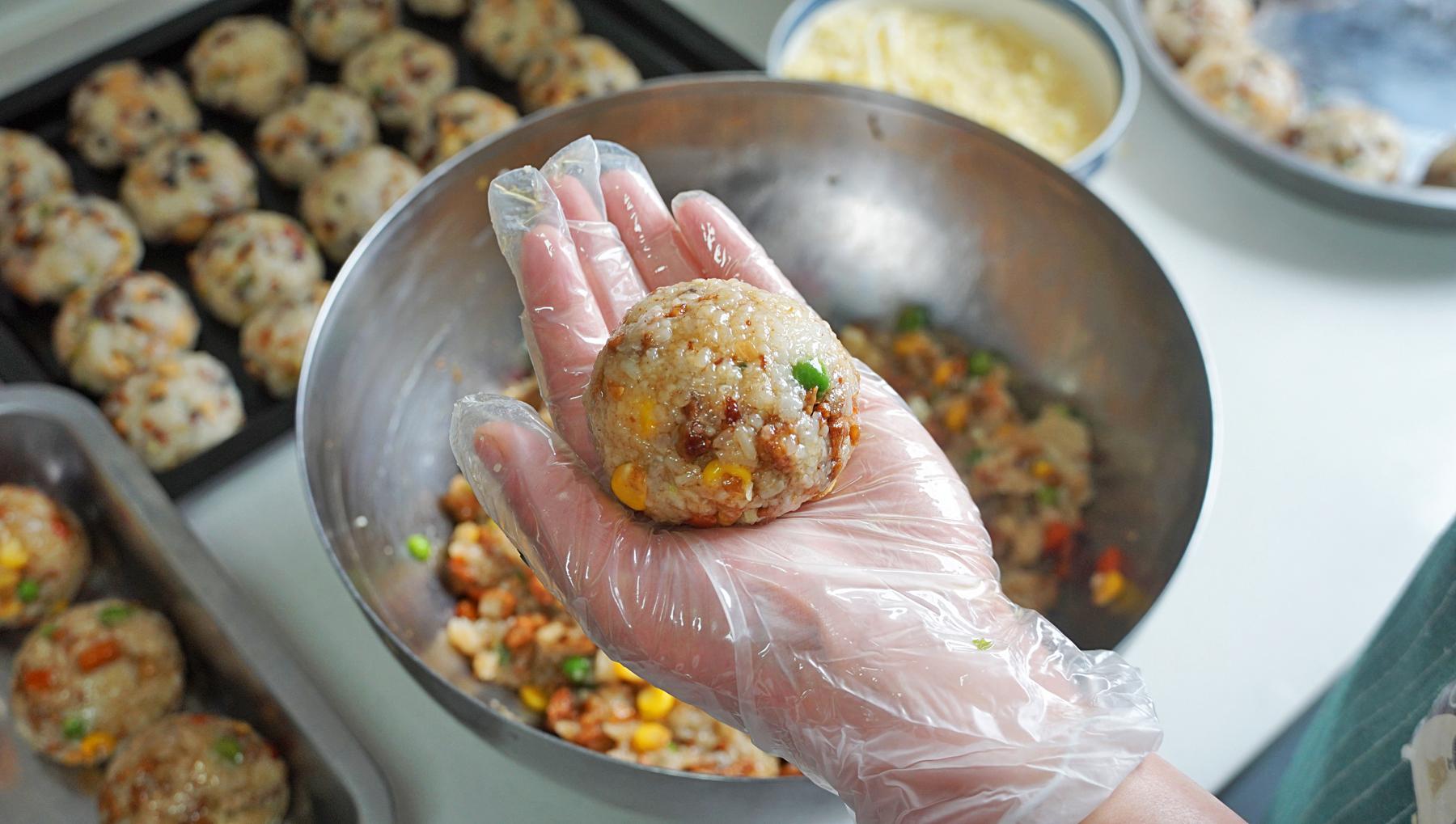 3、鮮肉的這一份我還加了一點芝士,就是抓一坨糯米飯,中間包上一小把芝士,然後包起來後搓圓就可以,這個口味的其實小朋友會更喜歡喫,蒸出來會有拉絲的口感;
