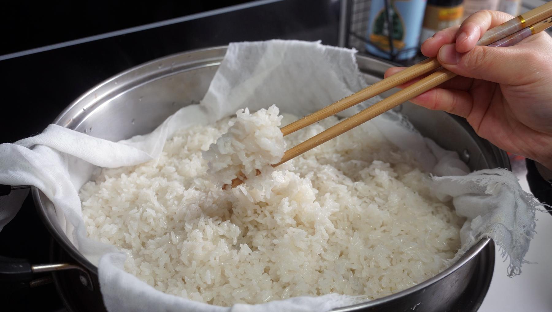 1、這時候糯米也蒸熟了,用筷子挑一下,沒有夾生就可以倒出來了;