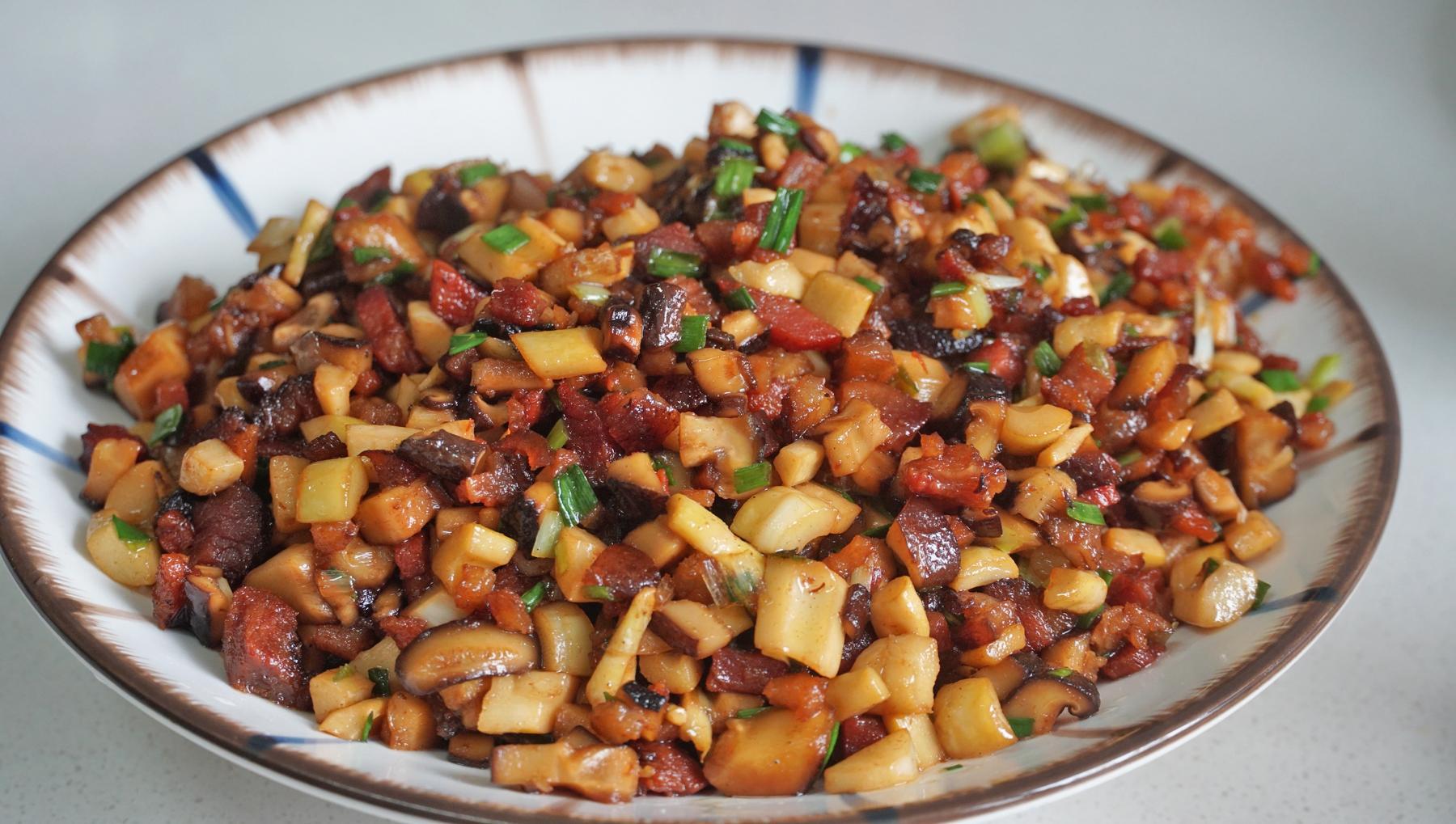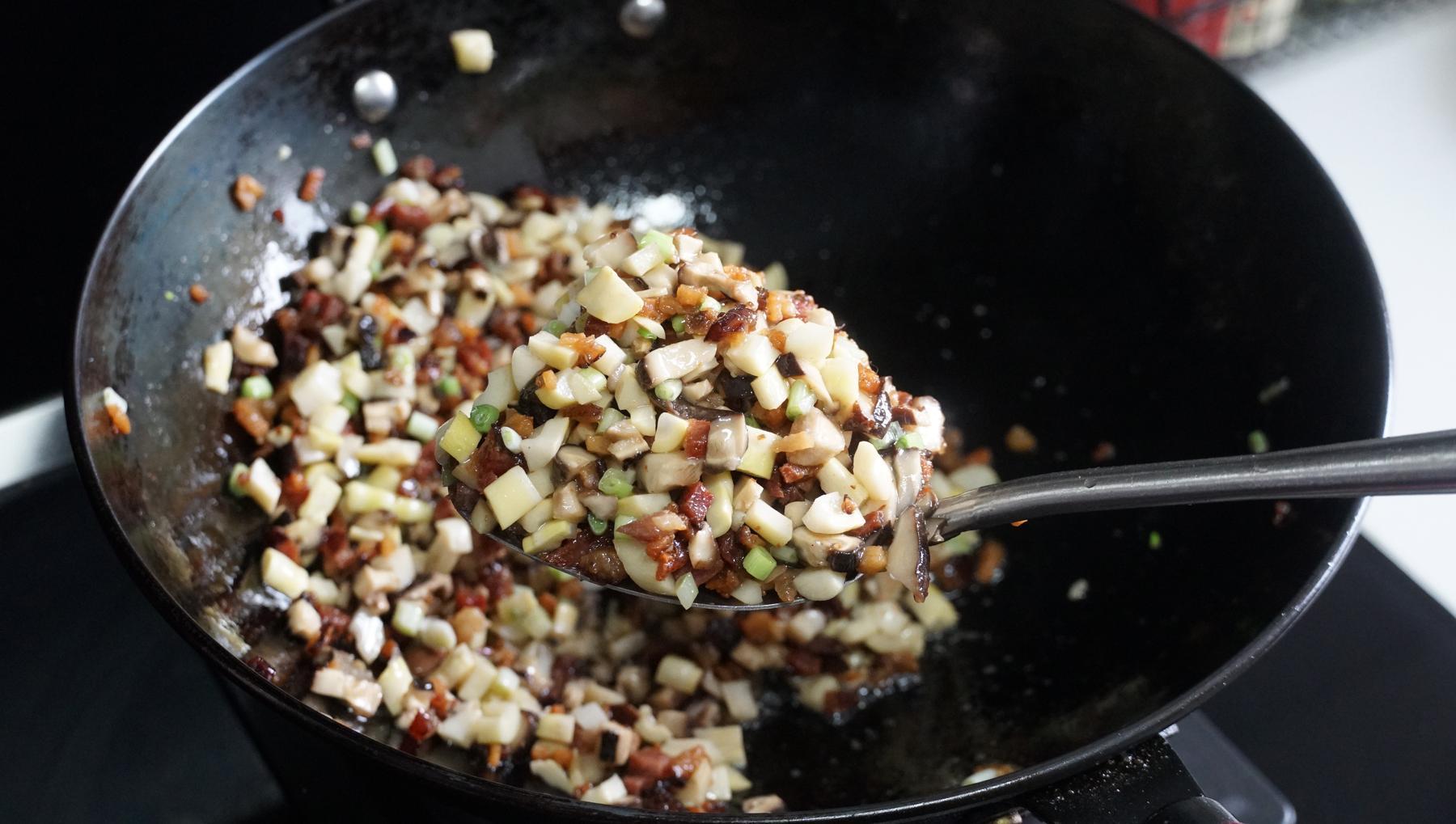 3、香菇和筍丁也加起來,可以多炒個兩分鐘,把香菇裏面的水分炒幹,調味加一點點的鹽、雞精、胡椒粉,出鍋前加一把蔥花,翻拌翻拌就可以盛出來了;