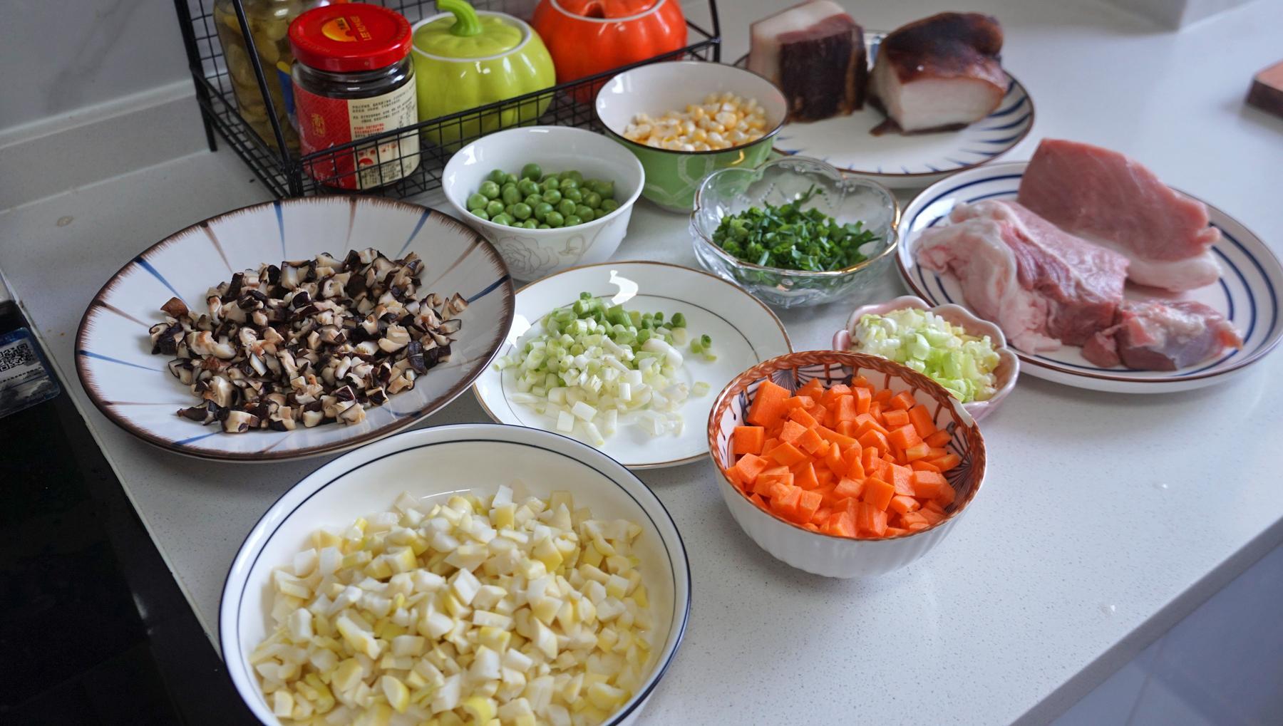 食材清單:糯米2斤、餃子皮、胡蘿蔔、青豆、玉米、幹香菇、竹筍、蔥花、芝士、豬肉、臘肉