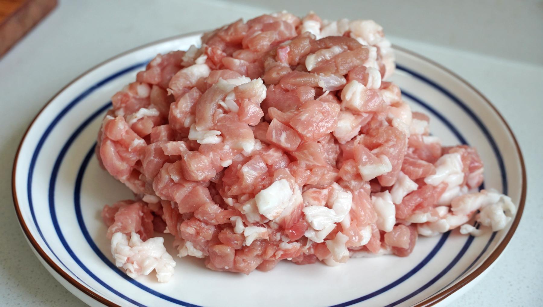 1、餡兒料我今天做了兩種,一種是鮮肉的,一種是臘肉的,鮮肉的就用豬腿肉,肥瘦二八喫起來會更油潤,切成小丁了就可以來炒了;
