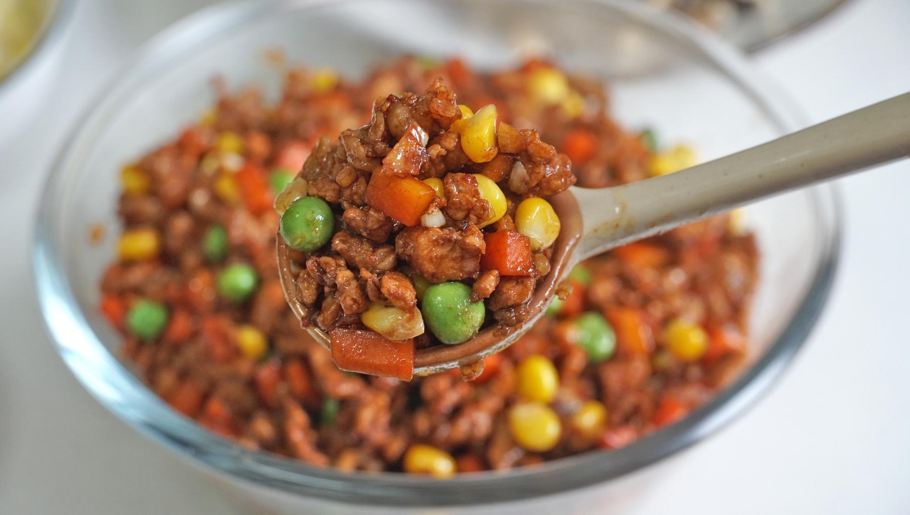 2、配菜的話我是搭配了一點玉米、青豆和胡蘿蔔,都是已經提前焯過水的 ;
