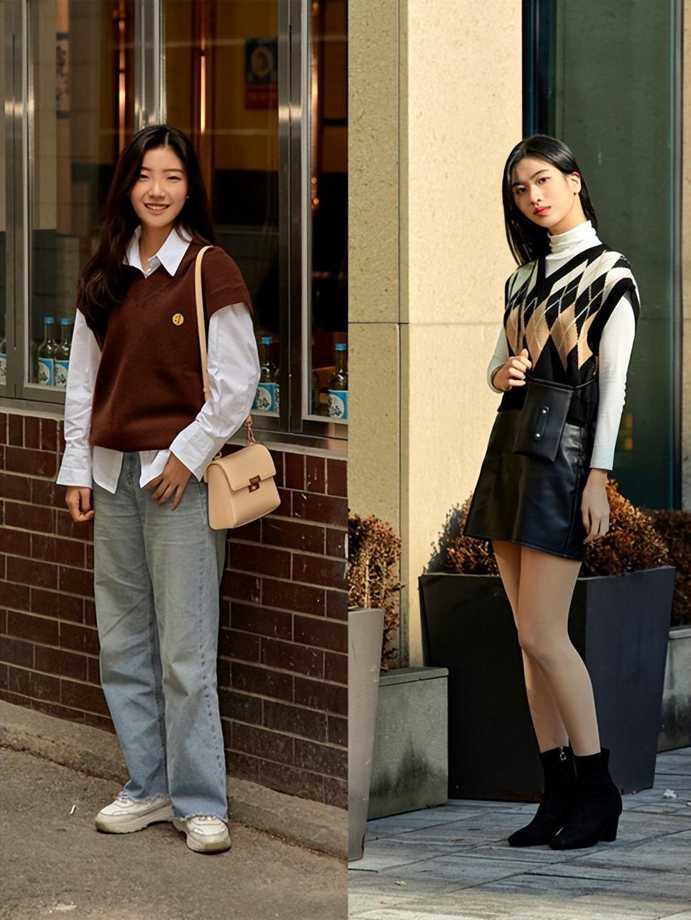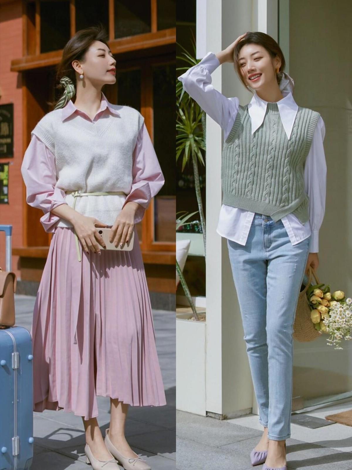 在針織衫裏可以搭配圓領毛衣或者襯衫,這樣的時尚疊穿風格可以豐富搭配的層次,帶來立體的搭配造型,再加上經典的學院風主題,一身好看的學院風穿搭就成功了。