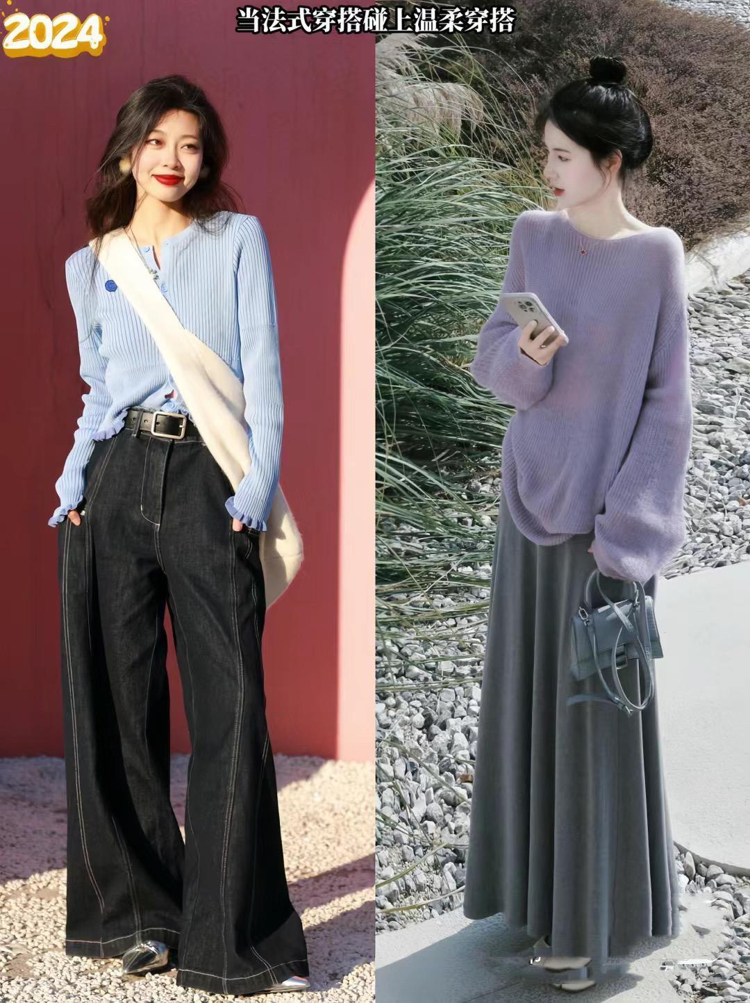 選擇具有溫柔顏色的針織衫,比如天藍色和紫色,都可以凸顯女生的白皙膚色。而下半身搭配時尚的寬鬆牛仔褲或者百褶長裙,則可以讓女生看起來溫柔範兒十足。