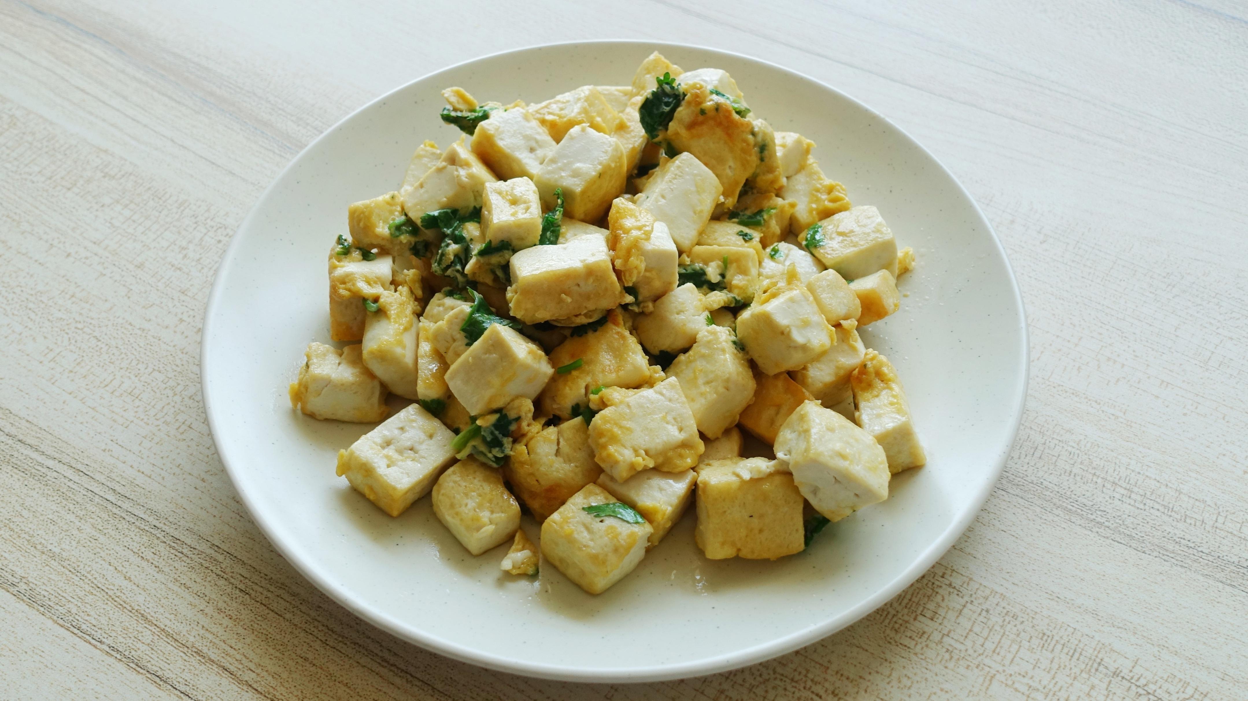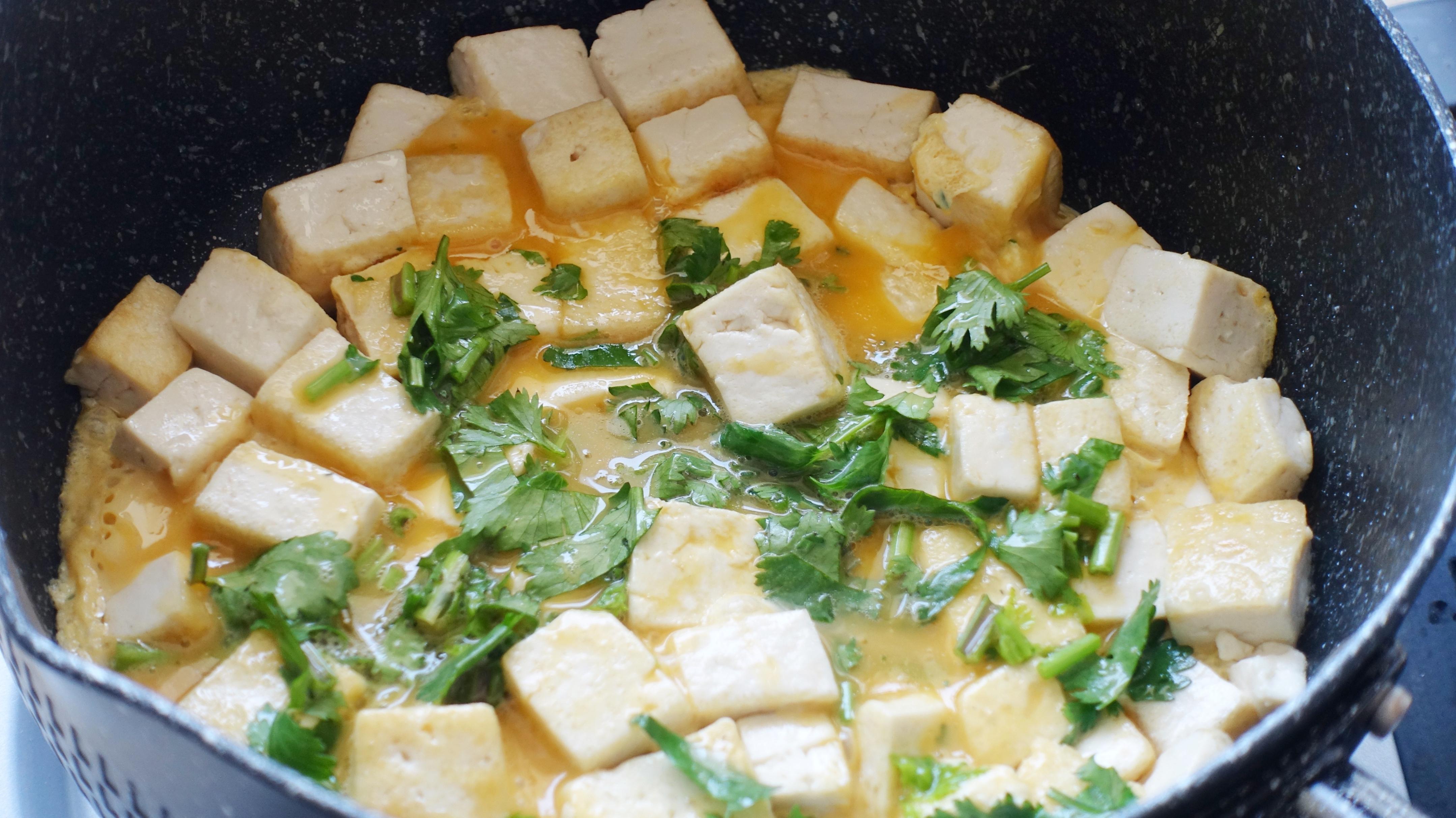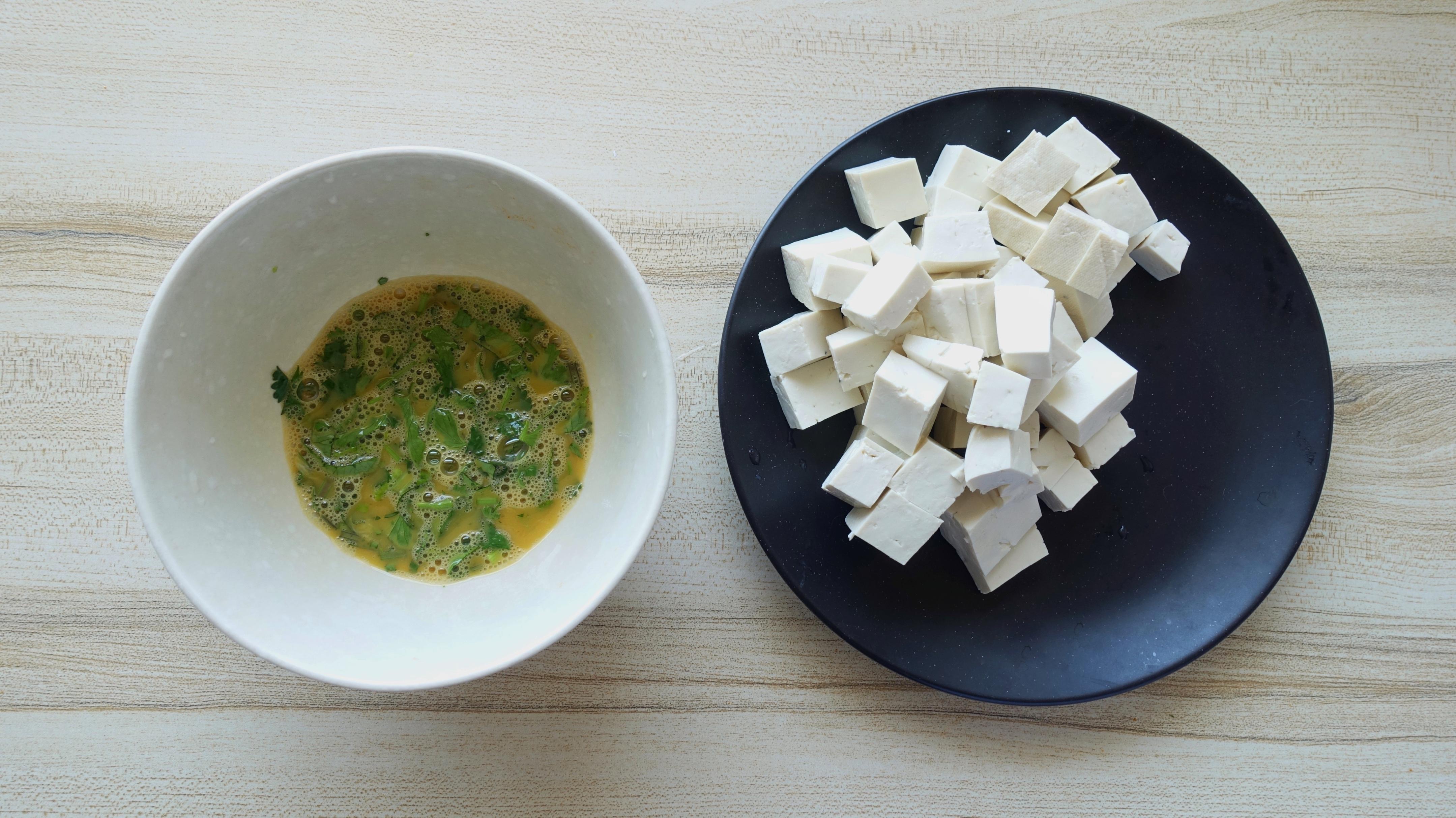 1、先備食材:老豆腐洗淨切小塊;雞蛋敲入碗中打散,再加些香菜末、適量食鹽攪勻;