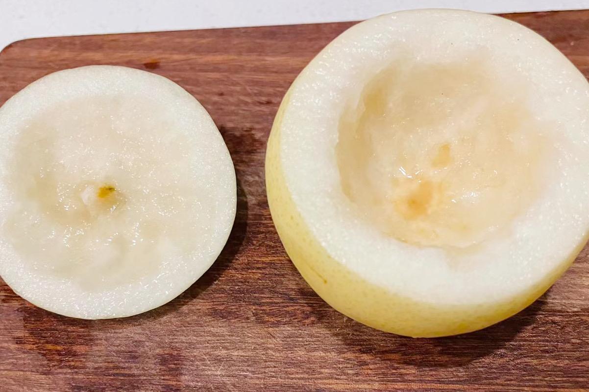1、將梨子洗乾淨,從梨的上方切下一片當蓋子,用勺子挖掉梨核;