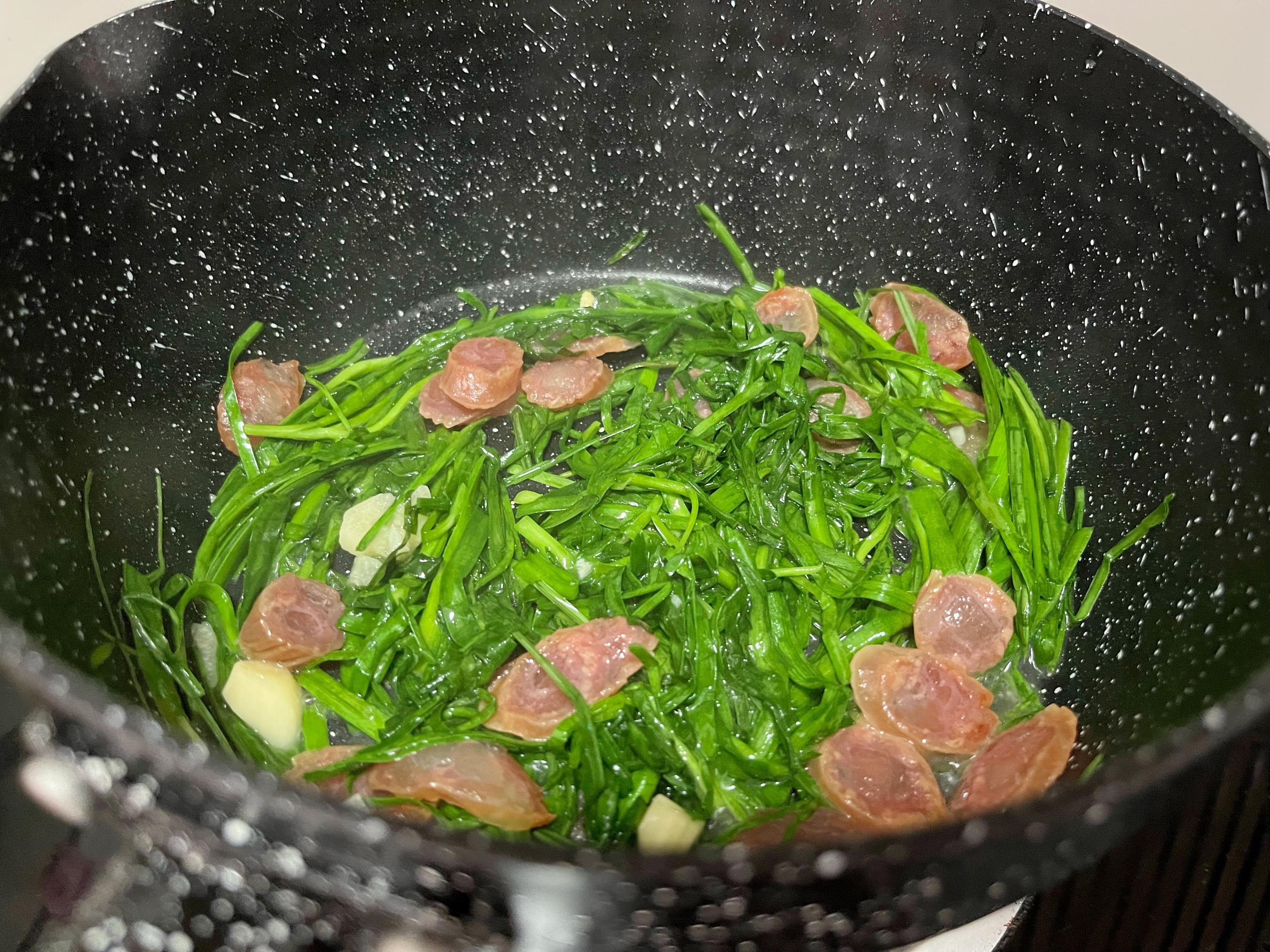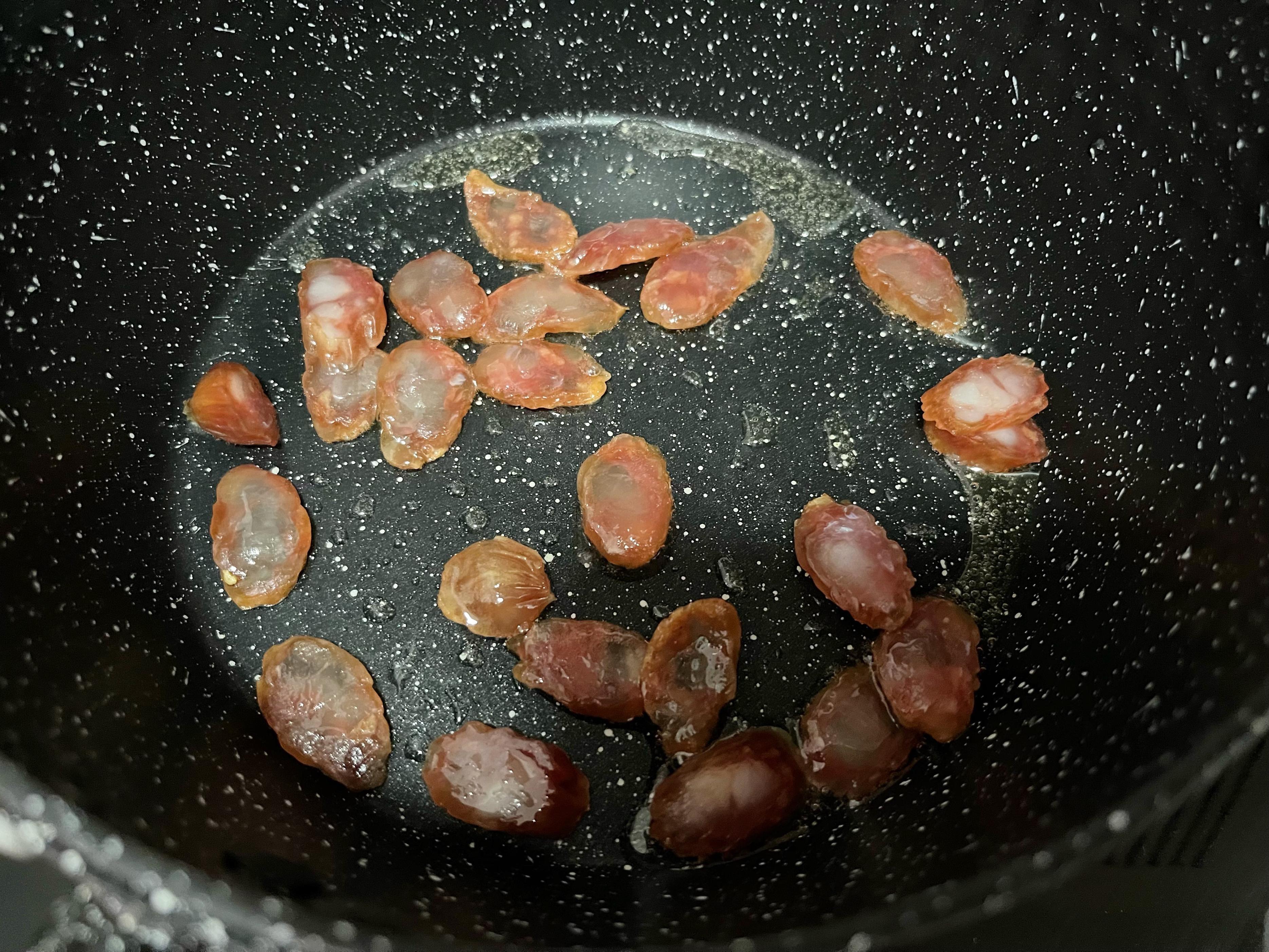 3、鍋中加少許油,下入臘腸,小火煸炒出油;