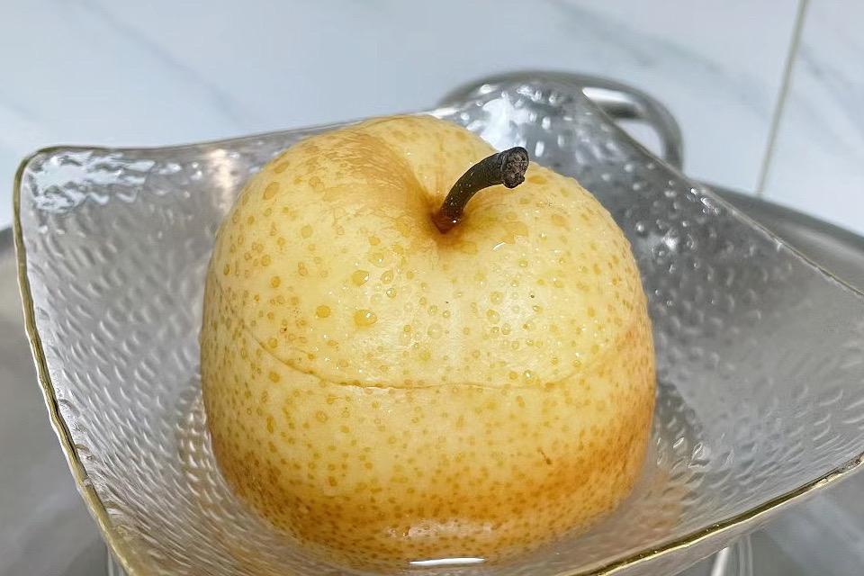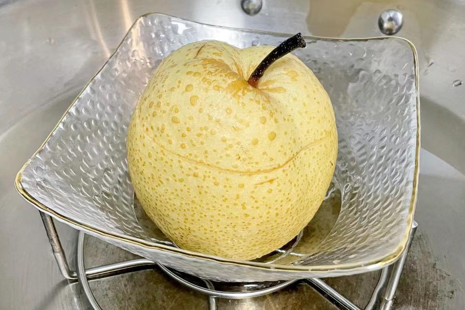 3、將梨子放入蒸鍋中,隔水蒸30分鐘,再關火燜5分鐘,即可享用。