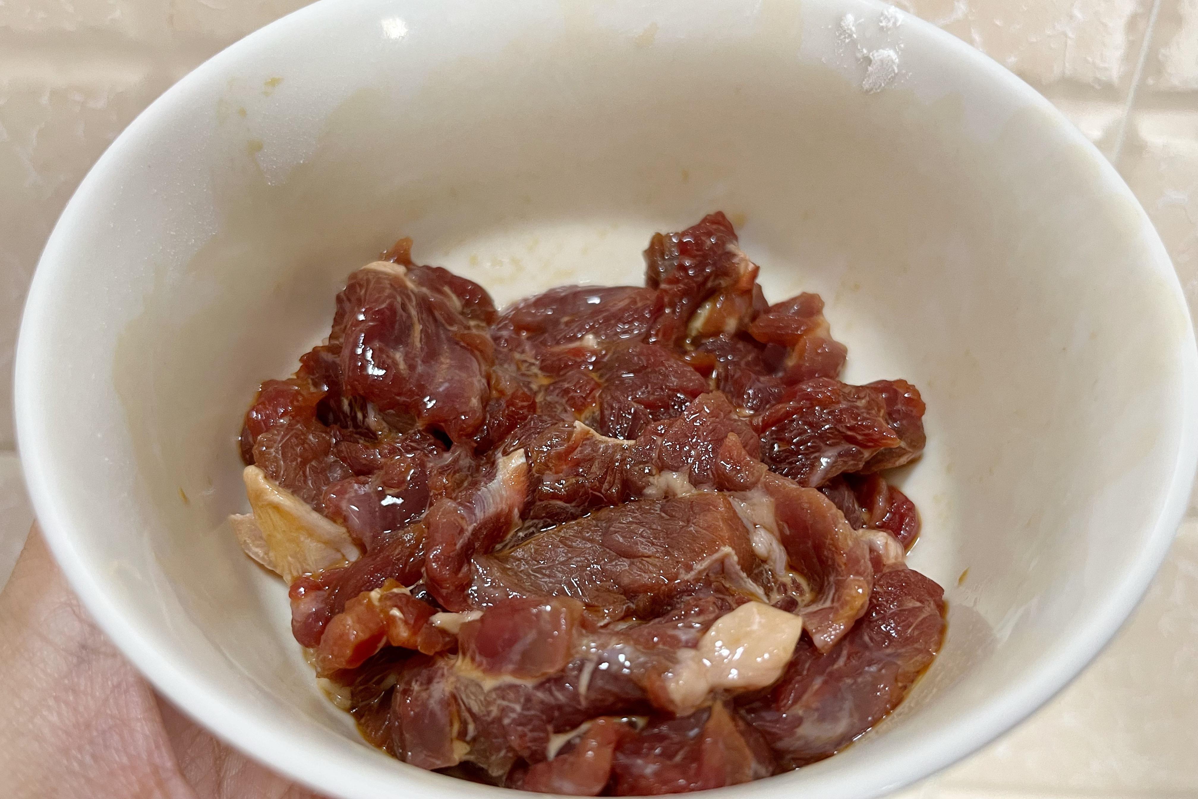 2、牛肉切薄片,加些料酒、生抽、生粉,抓勻醃製15分鐘;