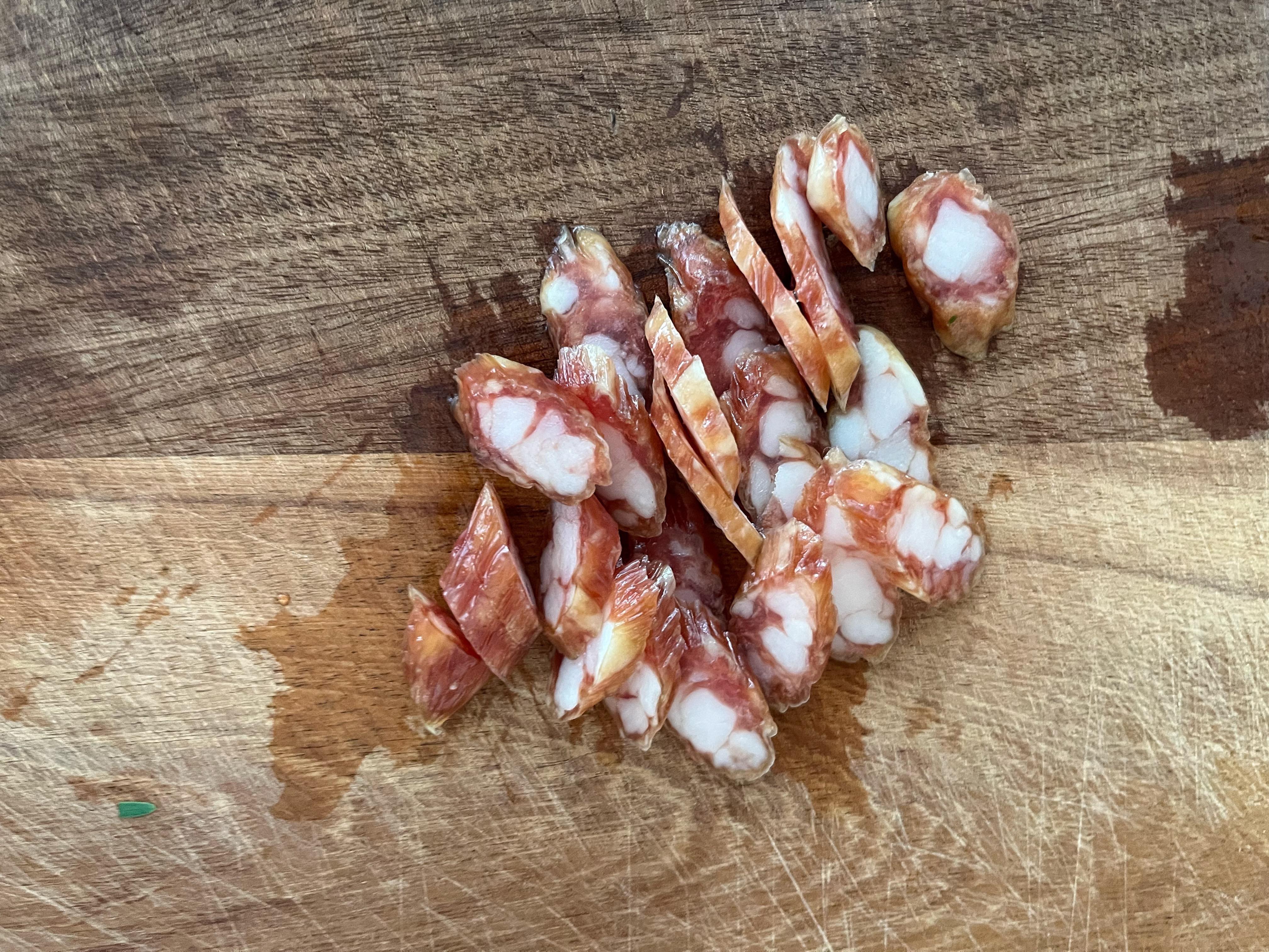 2、臘腸洗淨後,切成薄片;