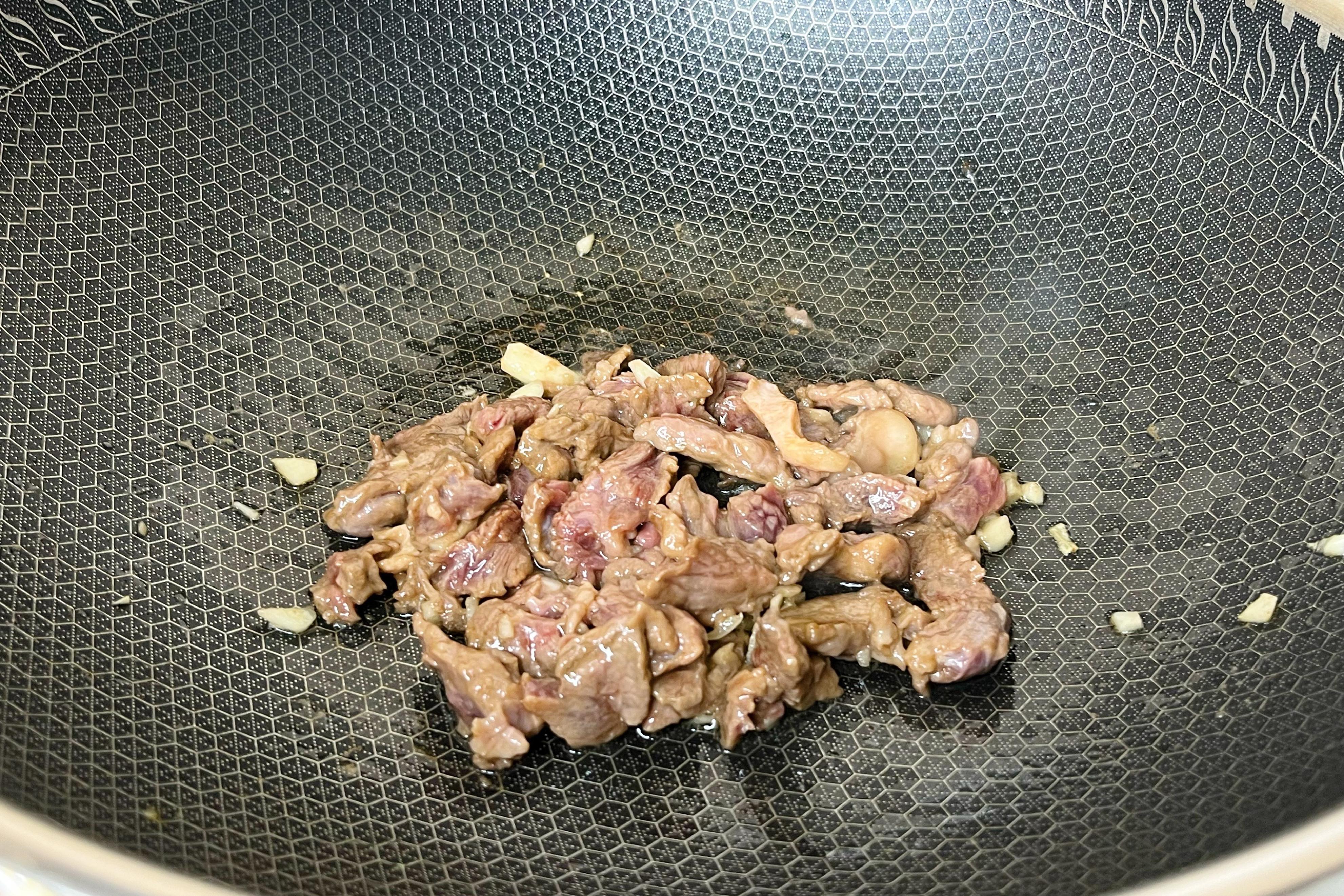 3、鍋中加油,下蒜末炒香,再下牛肉,大火炒至牛肉變色;