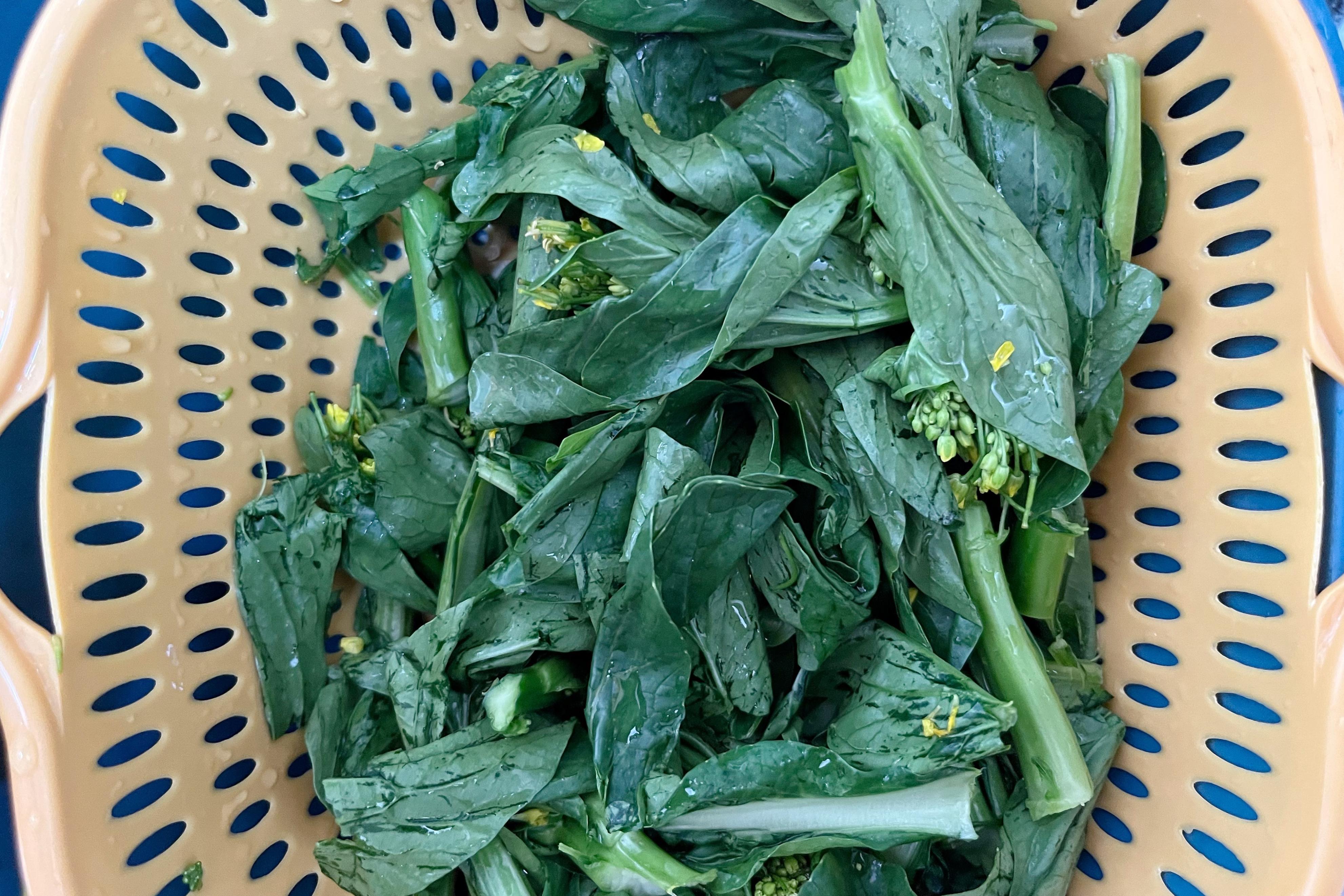 1、青菜掰開洗淨,控幹水分,我用的菜心;