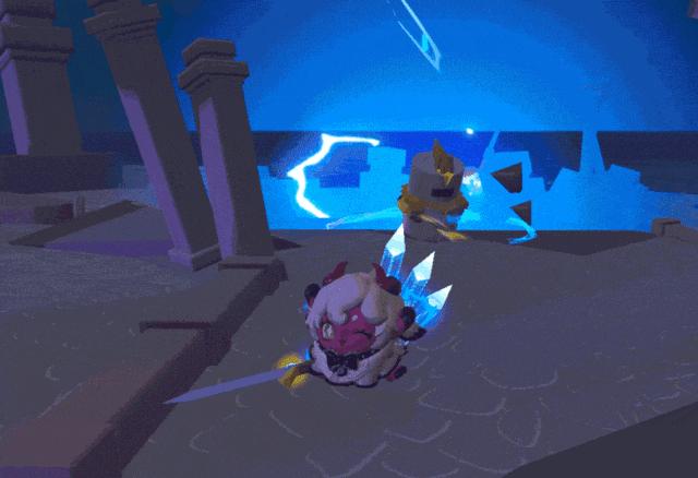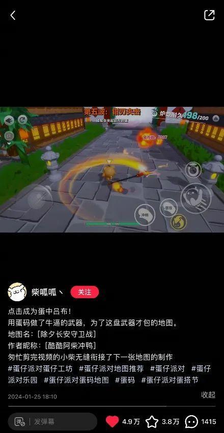 在這張BOSS戰地圖中,基礎的“抓取”“撲倒”按鍵被替換爲“攻擊”和“特殊攻擊”,BOSS血量實時顯示,不同武器賦予不同能力,水劍能生成隨機水柱沖天而起,雷劍能保持懸浮在蛋仔身邊並召喚追蹤閃電……功能強大的蛋碼切實地擴展了玩家的創作空間,12月14日蛋碼正式上線後,BOSS挑戰圖更是成爲了熱門地圖種類。