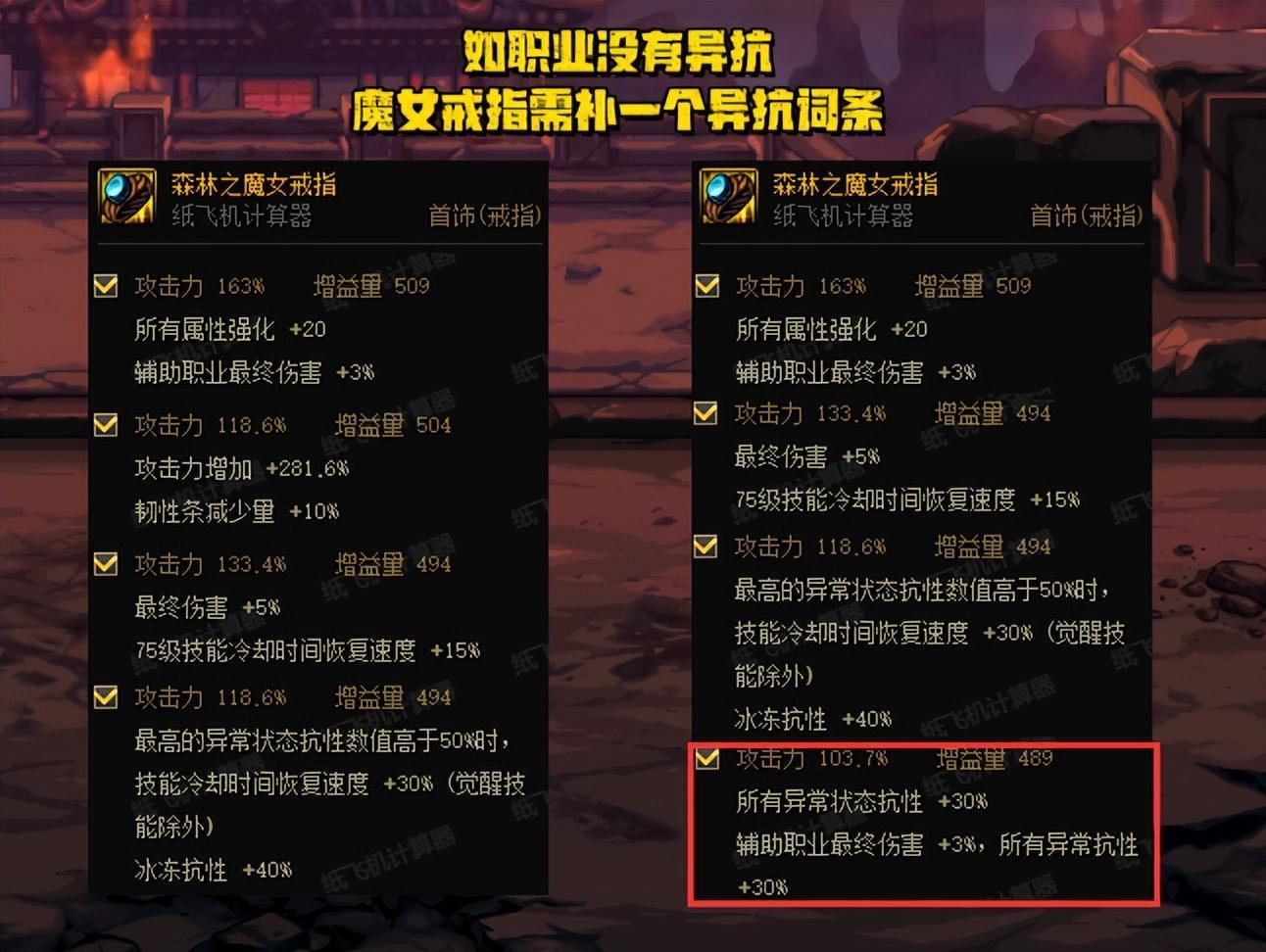 不過這裏需要注意的是,由於狂龍武器沒有自帶異常抗性,所以想要觸發“魔女戒指”的30%冷卻速度,還需要給魔女戒指補一個“異抗詞條”。