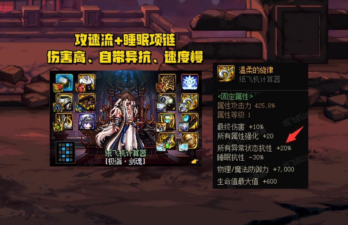 這一套搭配應該是攻速流的“標準模板”了,首先是“睡眠項鍊”比“爆龍王項鍊”高了2%左右傷害,再加上睡眠項鍊自帶20%異抗,魔女戒指不需要補異抗詞條,又多了2.5%左右;