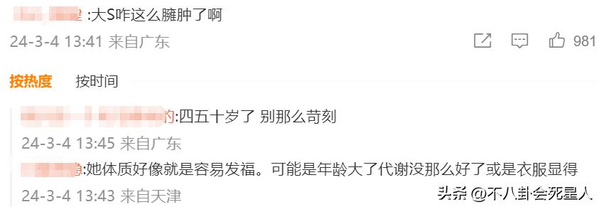 網友們驚訝於她的變化,怎麼會臃腫了這麼多。有網友覺得因爲大S本身就是易胖體質,在沒和汪小菲離婚之前,她的身材其實已經發福明顯了,加上現在她已經48歲了,發福是很正常的事情。