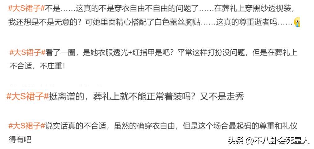 有網友吐槽,一時間不知道該說大S穿得包裹嚴實還是暴露好。更多網友則是提出,雖然說穿衣自由,但也要分場合。大S在葬禮這種嚴肅的場合上穿透視裝的行爲實在令人疑惑,也是不尊重亡者的行爲。