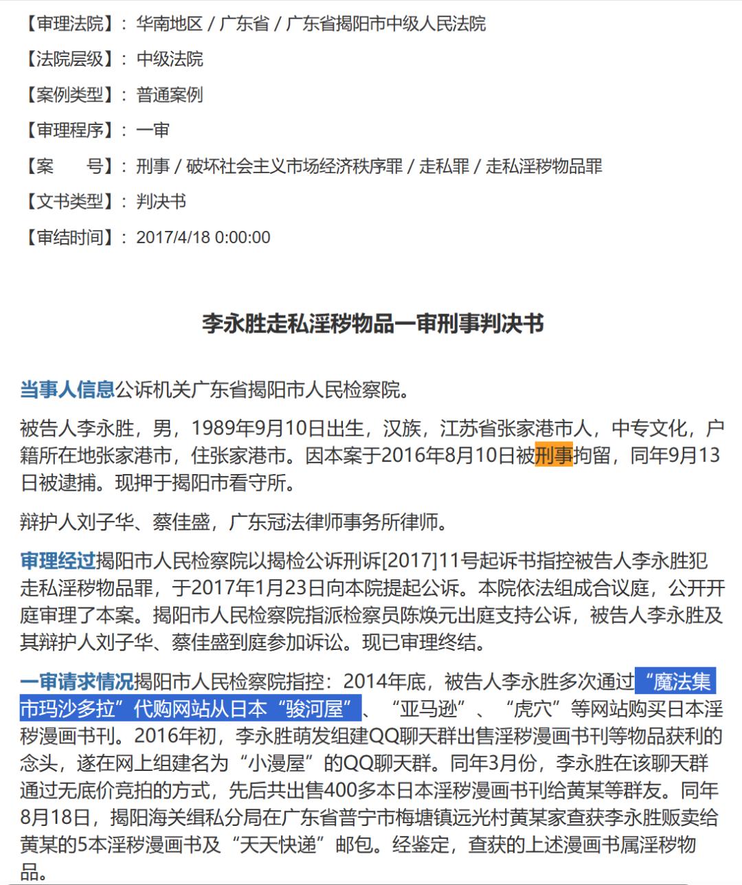2017年,廣東省揭陽市中級人民法院曾審結一起「走私淫穢物品」案,涉案人員被控以牟利爲目的,經由「魔法集市」代購大量成人書籍入境並轉賣,被判處有期徒刑五年,並處罰金人民幣五萬元。但此案並未對代購網站的行爲進行定性和追究。
