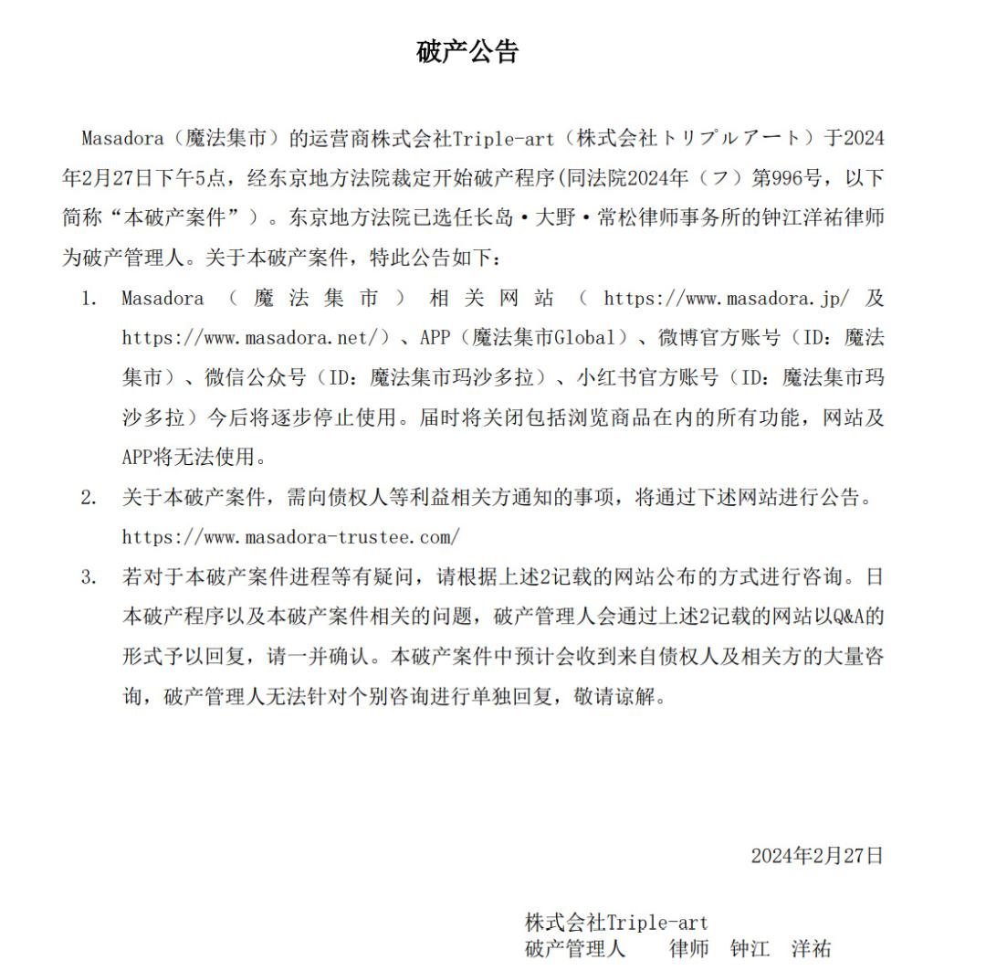 魔法集市是國內一家專注於二次元領域的海淘代購平臺,其位於日本的主體公司「株式會社Triple-art」在這一天宣佈申請破產,代理律師則稱「該公司已無資產,無法向各位購買人準備併發送商品」。