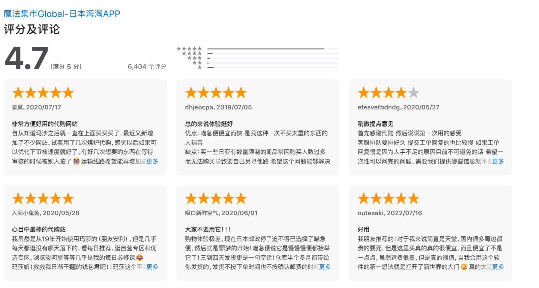 疫情期間,由於個人購買行爲變得更加困難,仍能在日本開展規模化採購並向國內郵寄商品的魔法集市業務增長顯著,其推出的App在下載榜上的位置也不斷上升,評價頗高。