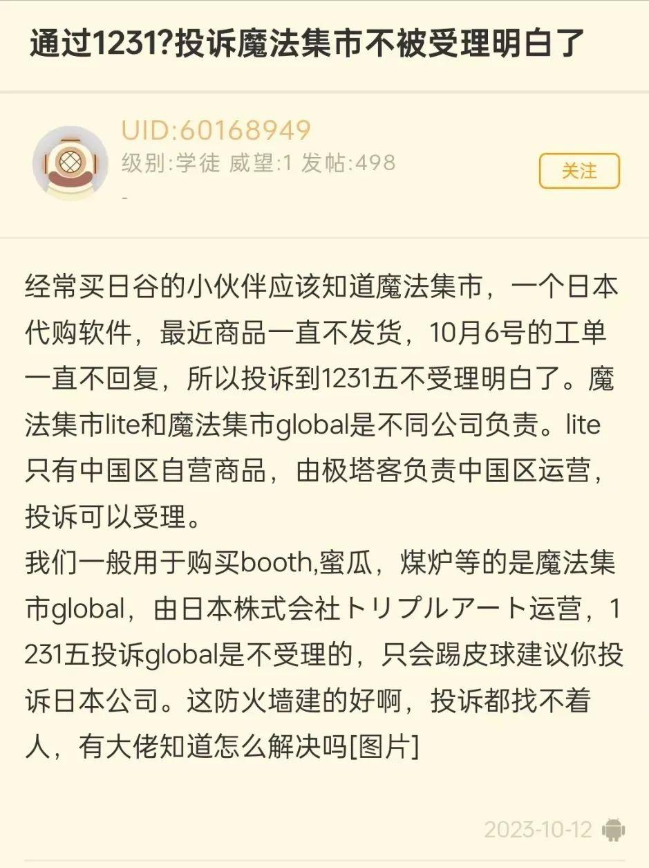 自去年10月以來,相關社區和微博上便頻繁有人反映魔法集市無法發貨、網站及App無法查詢訂單狀況等情況,但因爲公司的運營主體是海外企業,因此無法通過常規渠道來投訴,只能聽天由命。
