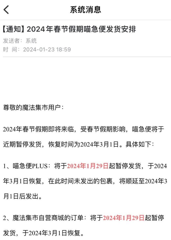 1月23日,魔法集市向用戶發佈通知稱其自營物流線路收春節假期影響自1月29日起暫停發貨,並將於3月1日恢復,但在2月28日,用戶們先等到的是公司破產的消息,發貨系統則在3月1日之後仍處於維護狀態。