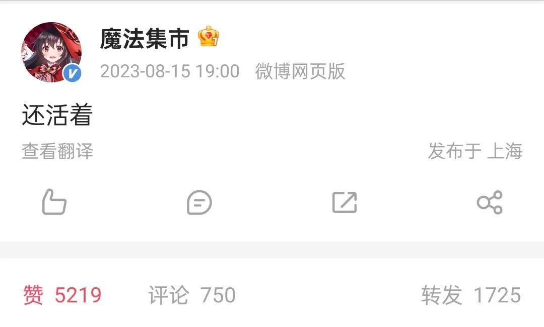 經歷了8月上旬的動盪,魔法集市官號在8月15日發了條微博自稱「還活着」。