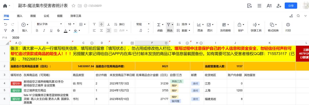 在兩天時間裏,就有千餘名受害者主動到這個共享文檔中填寫信息,涉及商品金額合計超1400萬日元,摺合人民幣約70萬元。兩個受害者交流羣也很快滿員。