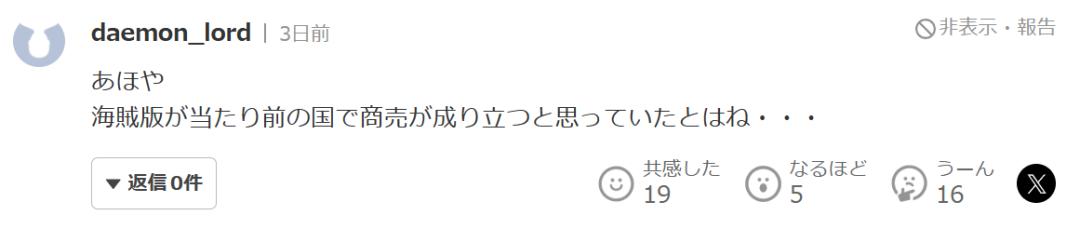 在日媒的相關報道下,有人用日語留言評論:「白癡,居然會想要在一個盜版橫行的國家做生意」,顯然還在以爲這真是一家日本企業因中國市場而破產。
