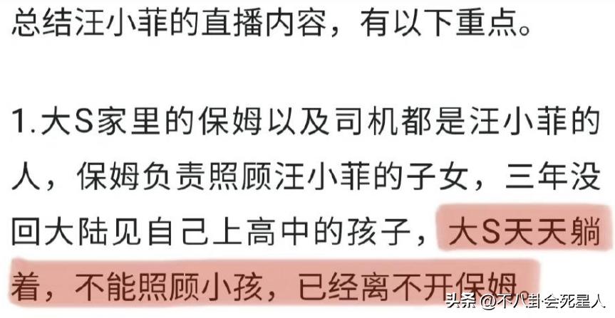 之後汪小菲在直播時又說過,大S二婚後天天躺着,不能照顧小孩,離不開保姆。