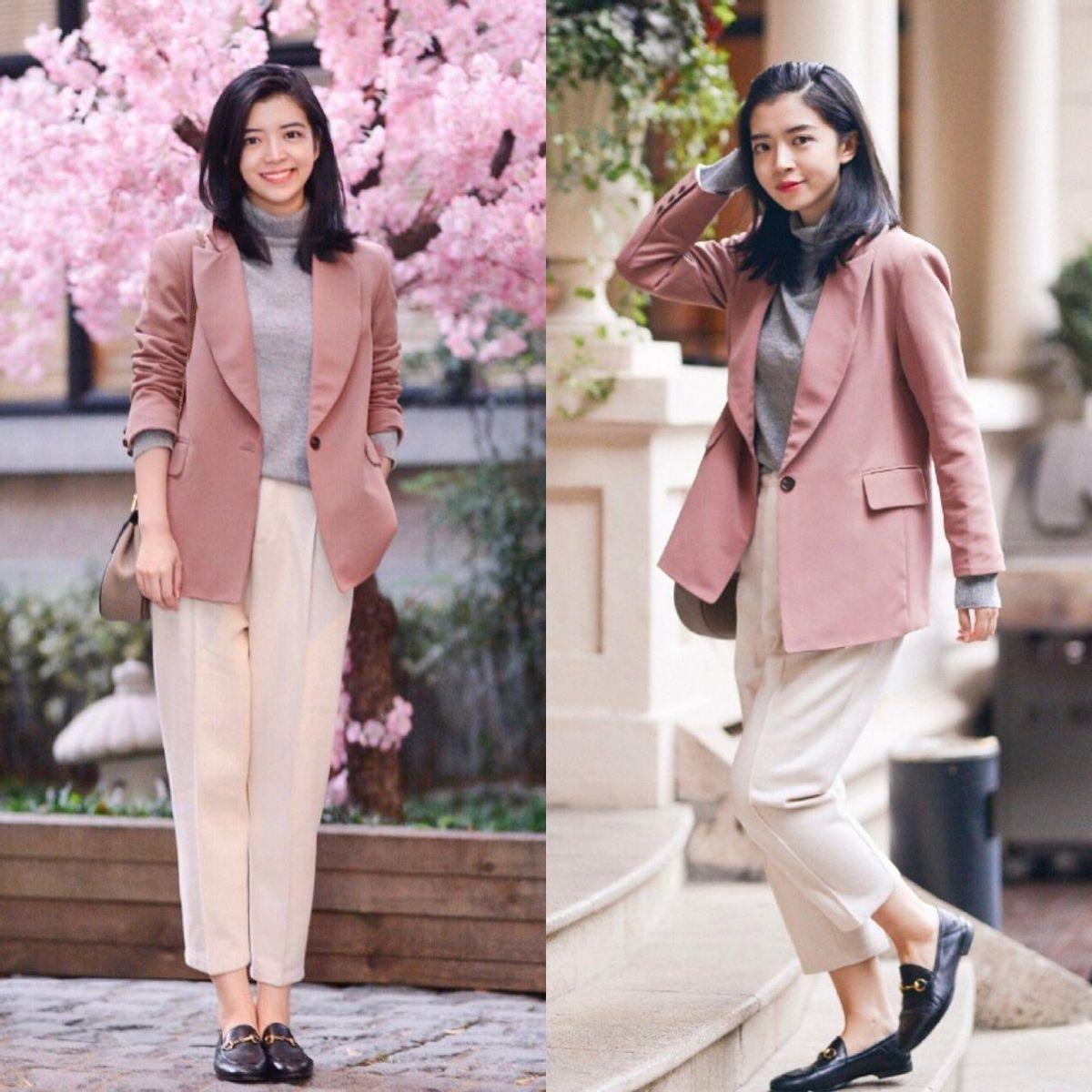 在具體搭配長款下裝的時候,建議大家可以學習一下這位小姐姐,身穿粉色西裝,再搭配一條中縫設計的九分西裝褲,不僅可以擺脫中規中矩的感覺,又能穿出減齡感。