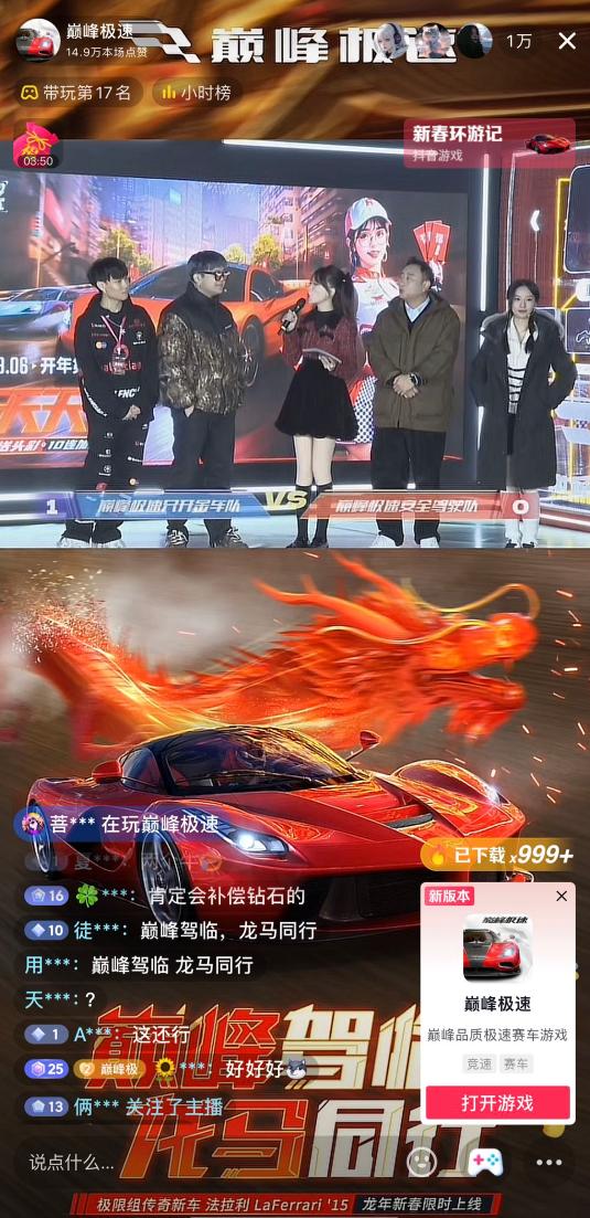 2月3日,這些創作者也加入到了抖音遊戲新春環遊記直播間,與玩家互動。比如藉助一鍵上車功能,玩家能與嘉賓們展開互動,一同賽車,在虛擬世界提前兜風過年。彼時,直播間也打通了一鍵下載同款的功能,光單場直播遊戲下載數量就超過了5200人。