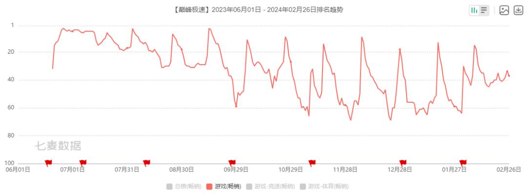 作爲去年與《逆水寒》手遊同期上線的競速類產品,《巔峯極速》看起來相對小衆而低調,同時也取得了不錯的成績。據七麥數據顯示,它曾登上過iOS暢銷榜前三,後續則穩定在了暢銷榜前70。