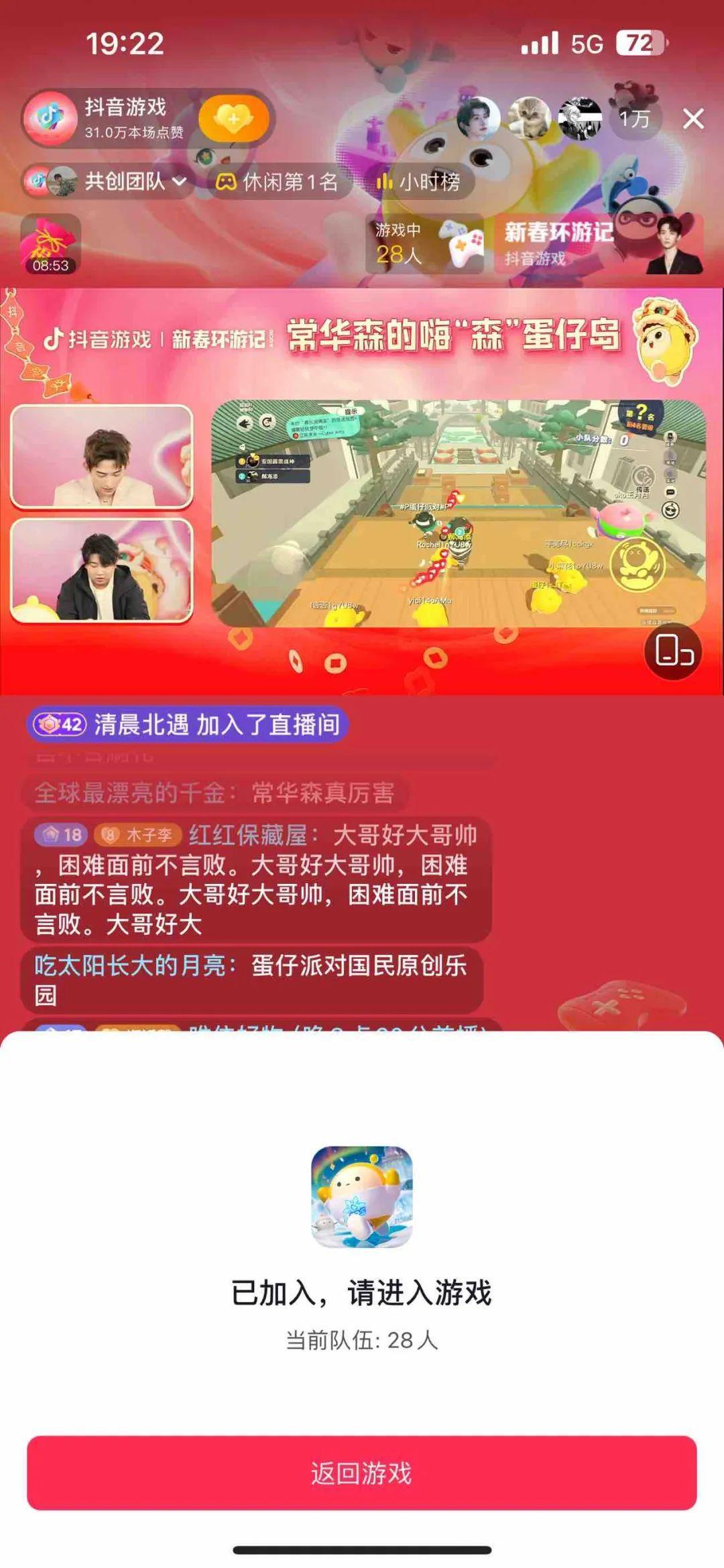 譬如“一鍵上車”功能。在新春環遊記期間,它成爲了玩家與明星、主播近距離接觸的橋樑。在1月20日抖音遊戲的直播中,玩家就曾通過相關功能和新生代演員常華森、主播郝海添一同遊戲。