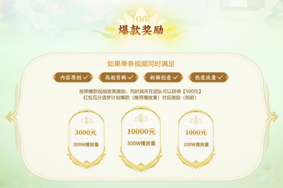 在上期的“造夢計劃”中,就已經有創作者拿到了最高6000元的獎勵,相當於普通上班族一個月的薪資!不過我們不要過於羨慕,因爲新一期的“造夢計劃”開始了!新手可以在老玩家的帶領下快速上手,一些低門檻的獎勵如“牛刀小試”獎也能輕鬆拿下,再將自己的剪輯水平不斷磨練,視頻流量和熱度咱們不用管,官方會提供定製化扶持的!