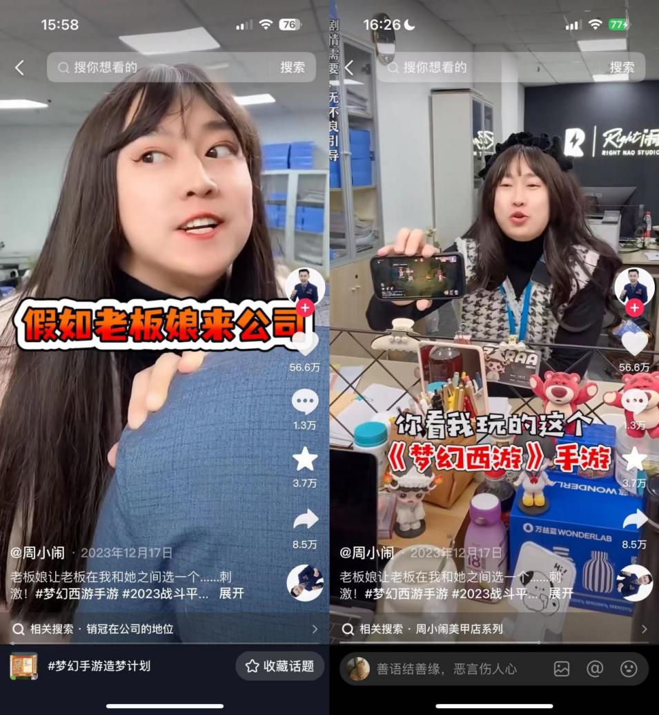 越來越多的人被“造夢計劃”吸引,不單單是玩家,還有其他來自不同領域的博主。如千萬粉絲博主“周小鬧”,他通過自己賬號日常搞笑的風格下,創作了一個個幽默誇張的小短劇,讓《夢幻西遊》手遊在抖音上迅速傳播,被更多人看見,爲“破圈”提供了契機,影響力逐漸擴大,完成對泛大衆圈層的跨圈滲透。