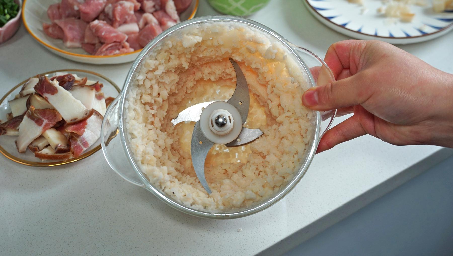 3、豬肉打的時候可以加幾片生薑,給它去下腥,然後也稍微攪一下,倒出來後和藕丁放一起,調味兒和平常一樣的:鹽、雞精、生抽、料酒、蠔油,一點點的胡椒粉,再加1個雞蛋和1把蔥花,給它攪拌攪拌;