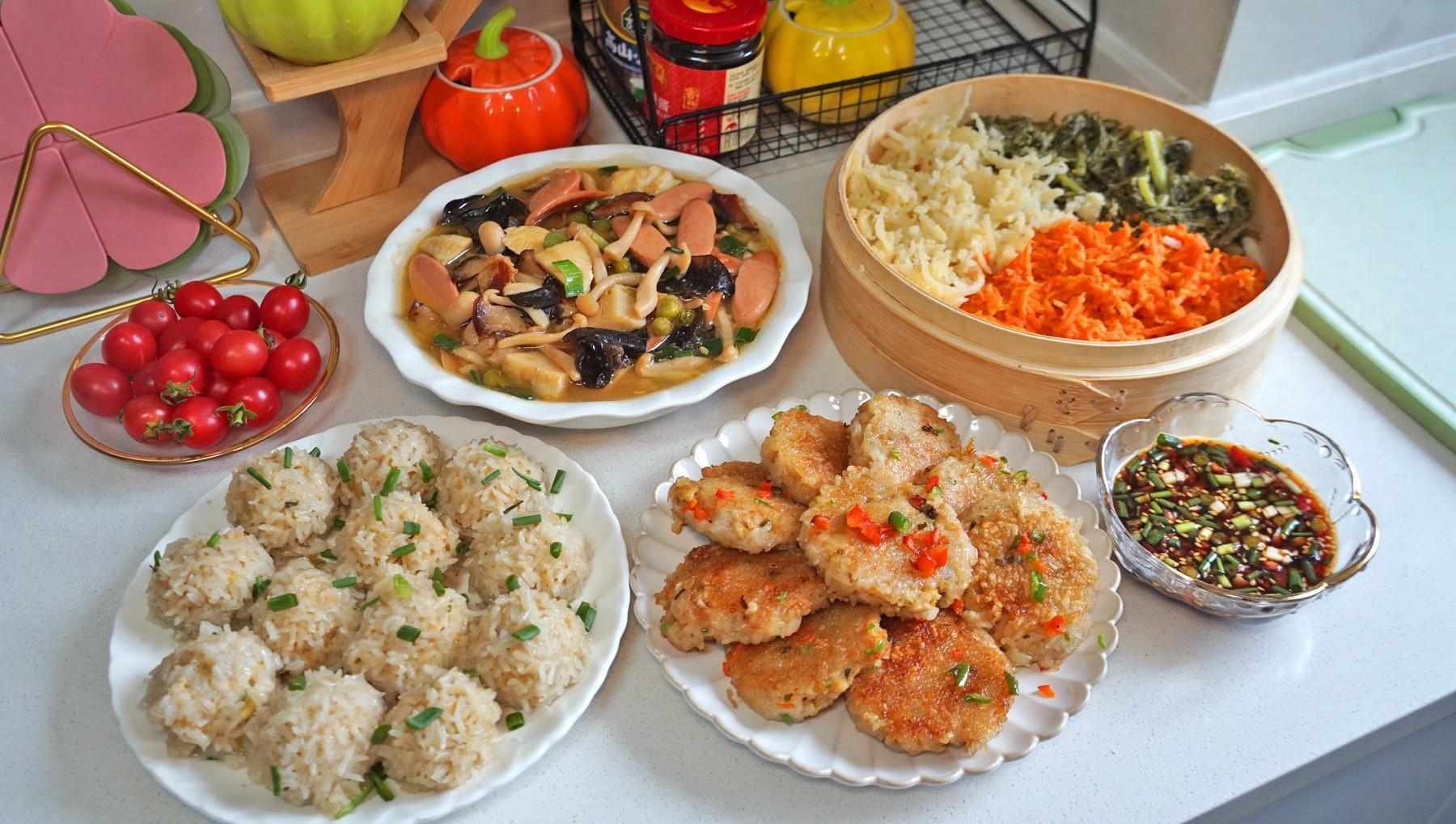 大家中午好吖,今天的午餐又是四個菜,做了一個我最愛喫的三鮮煲,還做了一個脆皮糯米藕和糯米丸子,這兩個菜做法其實都是一樣的,只是造型不同,