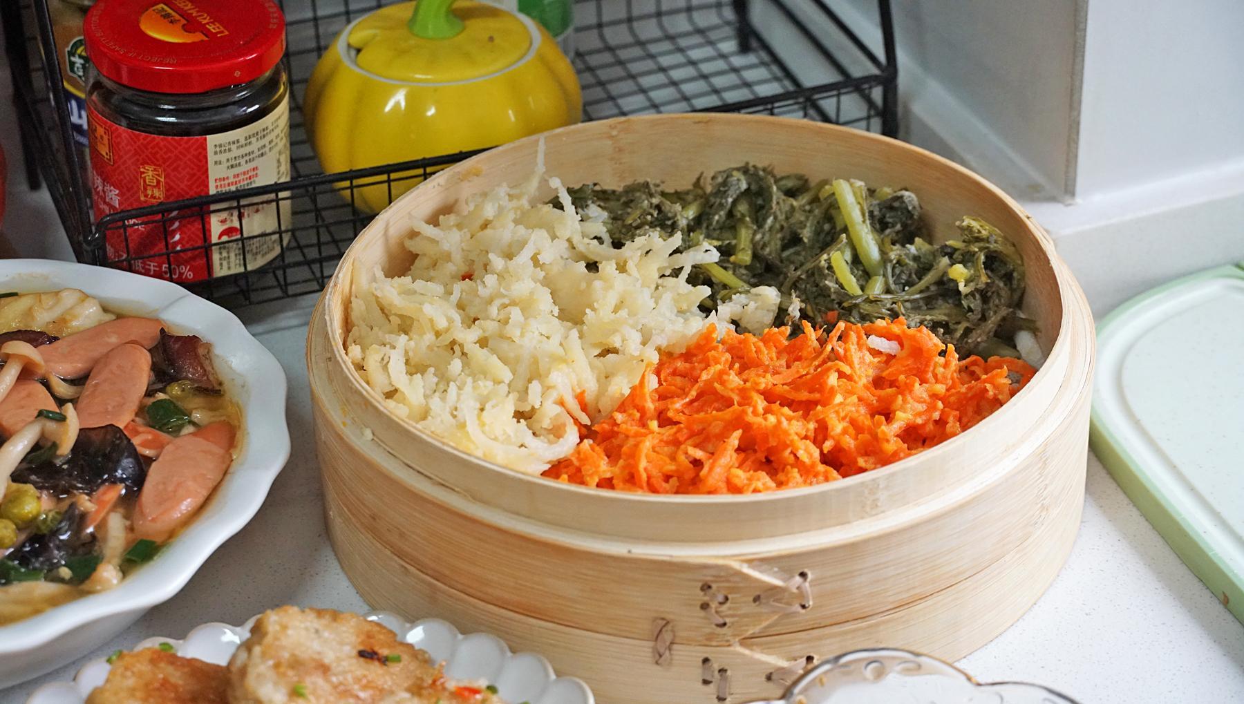 脆皮糯米藕最後稍微的用油煎了一下,口感上有點區別,青菜的話我今天是做的一個蒸菜拼盤,用了一點茼蒿、胡蘿蔔、土豆絲,喫起來蠻清爽的,也很軟糯,你可以當菜喫,也可以當主食。