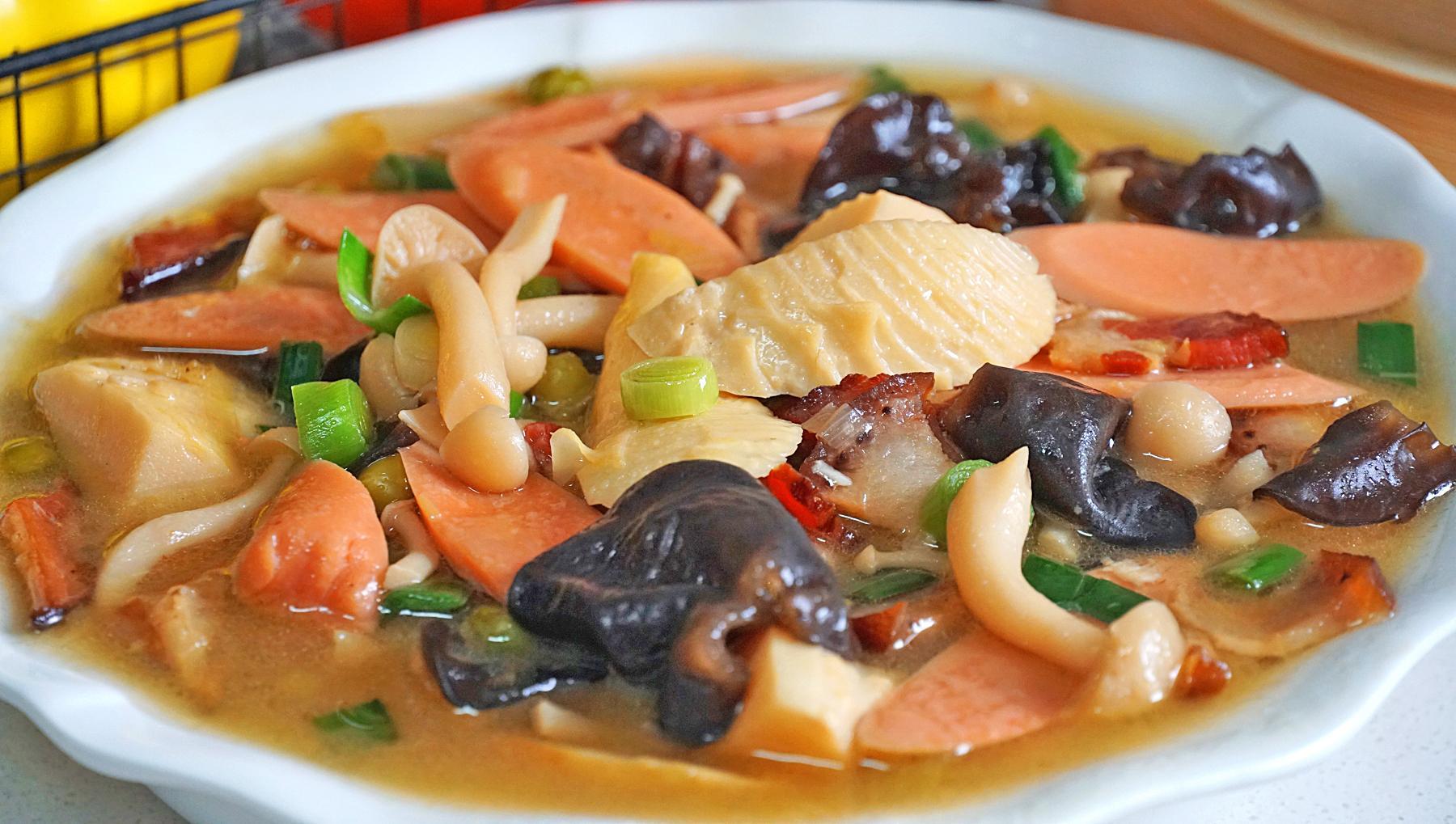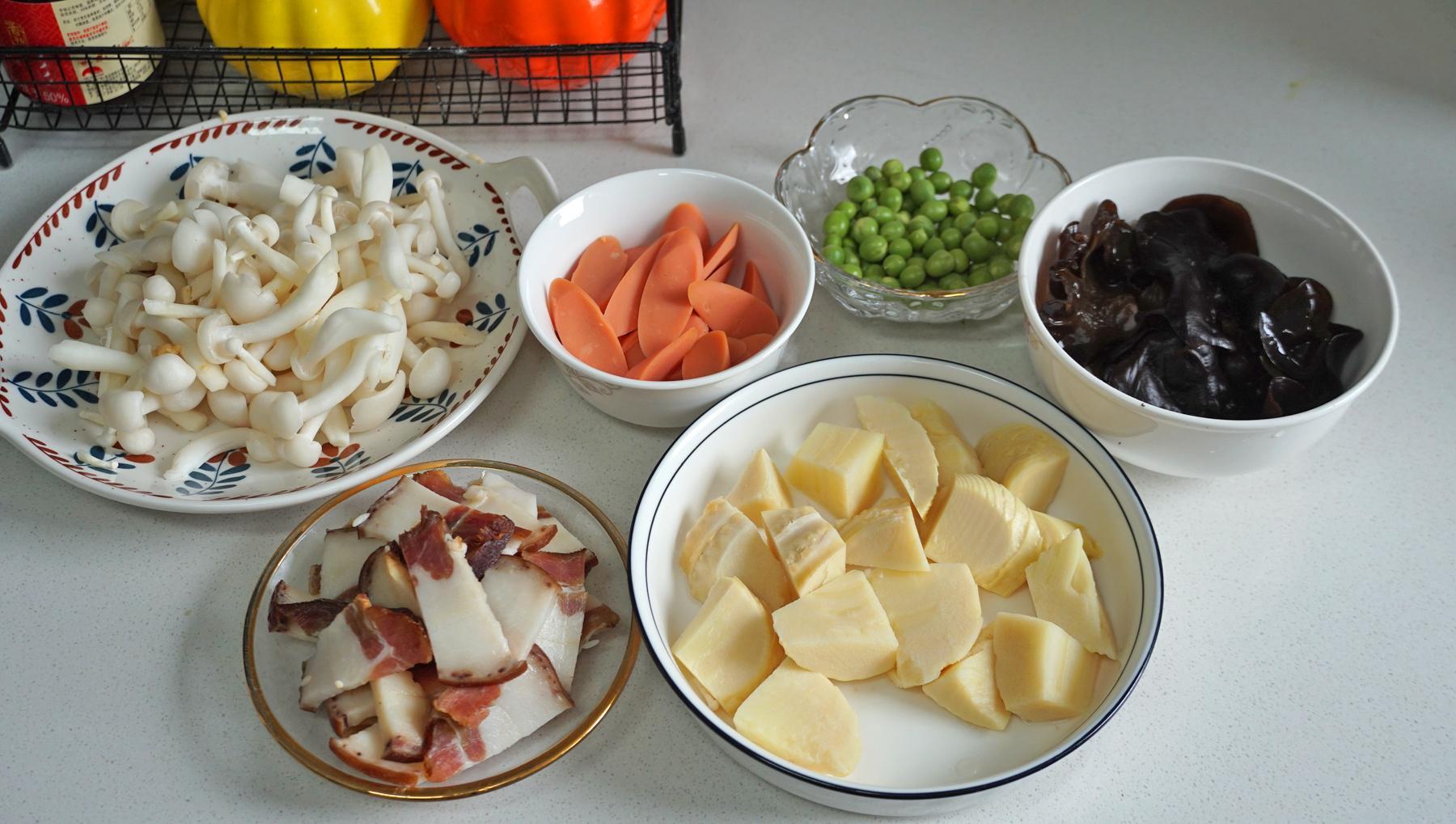 1、三鮮煲的話,我是搭配的一點冬筍、青豆、白玉菇、木耳、臘肉、火腿腸;