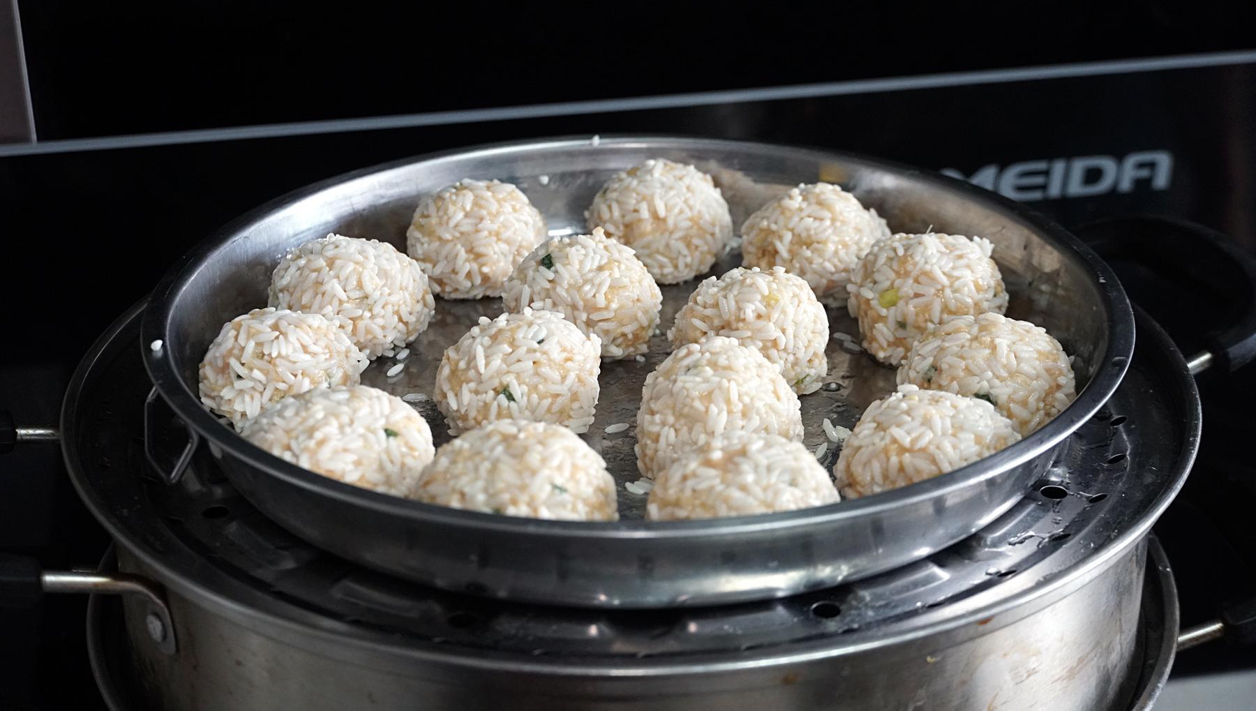 鍋裏的糯米也熟了,丸子的話撒點蔥花直接喫,就是我們湖北這邊過年飯桌上必備的一個珍珠糯米丸子,