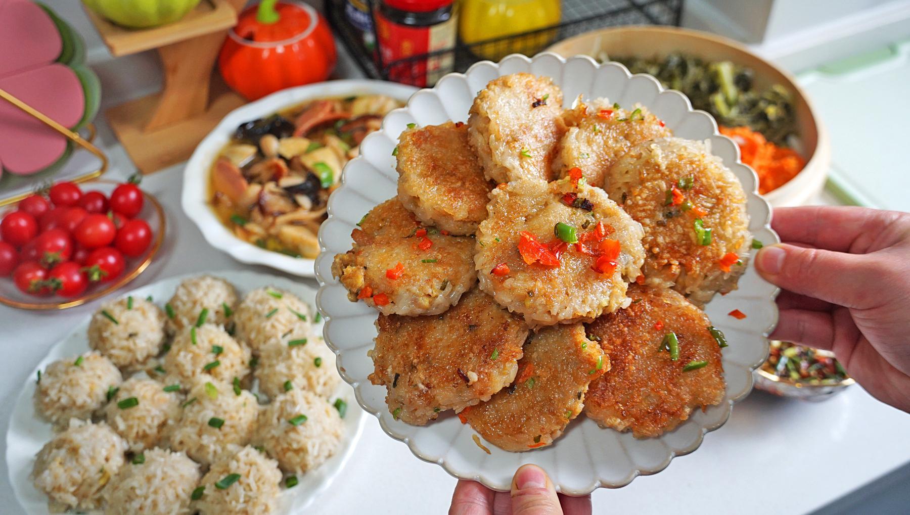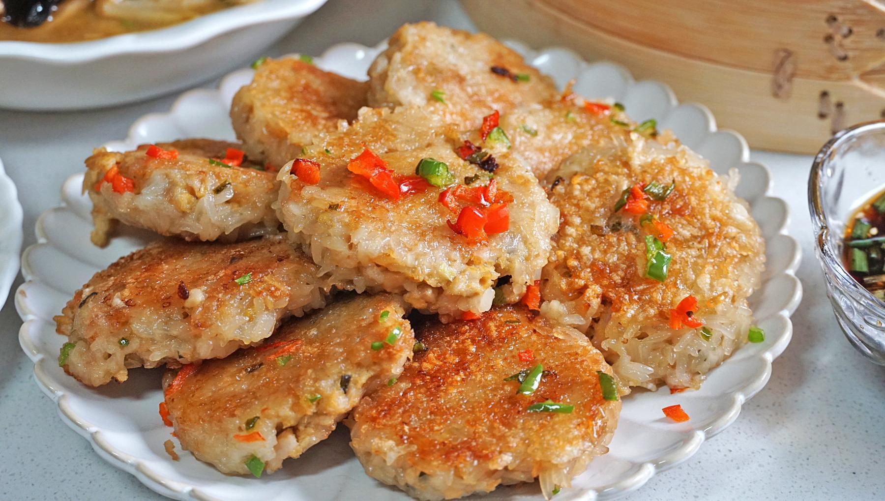 糯米餅放到油裏面再拖一下,兩面都煎成這種金黃色焦焦的,撒點青紅辣椒丁點綴一下就給它盛出來,