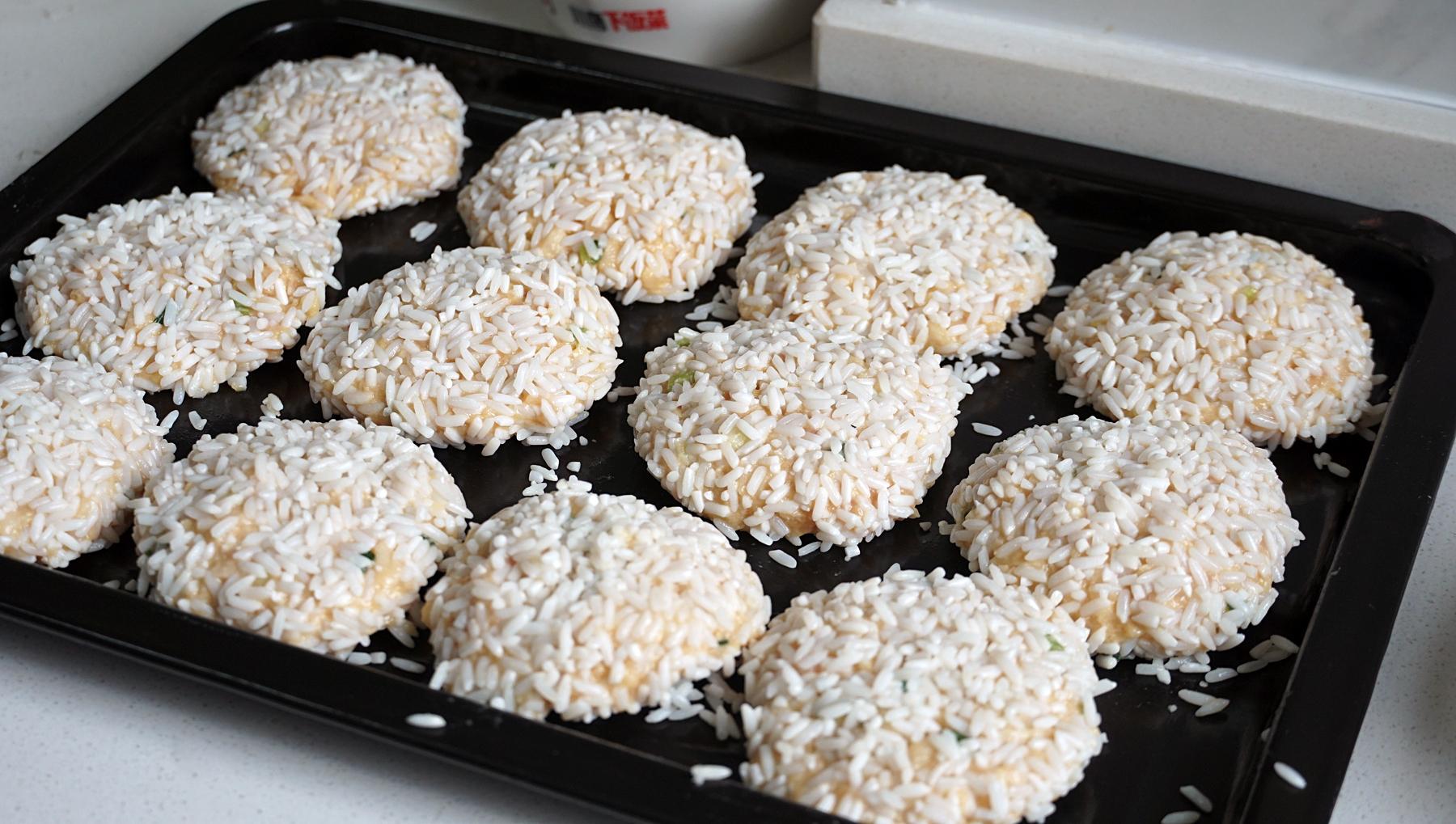 5、做的時候就是抓一把肉餡兒團一團,然後按壓一下就是餅的形狀了,再放到泡好的糯米里面,表面都給它都裹上這種生的糯米,我剛好是做了一盤;