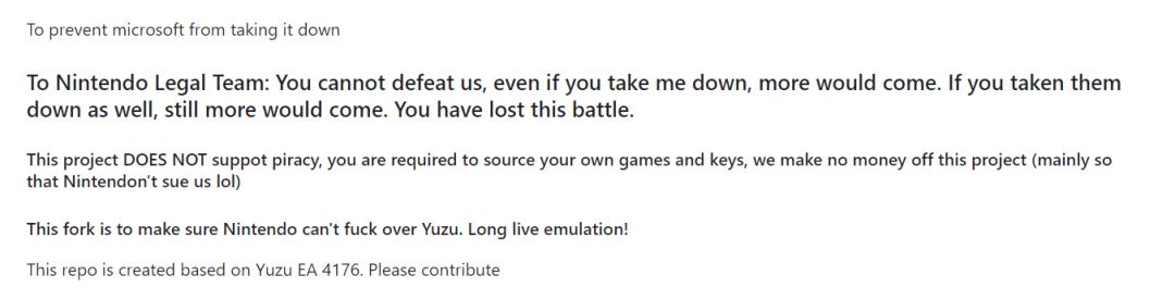 Suyu項目明確表示爲規避法律風險,不會獲得任何收入,也強調不支持盜版行爲。同時還在簡介中發佈了一段對任天堂火藥十足的宣言,宣稱“任天堂法務部已經輸了這場戰鬥”,因爲會有Suyu以及“更多的後繼者”繼續接管Yuzu的代碼,而Suyu的名字也是英文“Sue-You(起訴你)”的諧音,以紀念被起訴的Yuzu模擬器。
