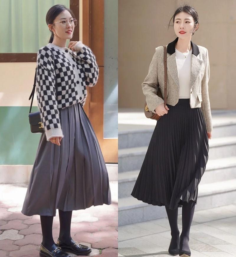 想要穿出完美的黃金比例,建議大家可以選擇短上衣進行搭配,跟高腰款式的百褶長裙進行組合,配上一條黑色打底褲,自然更顯瘦。