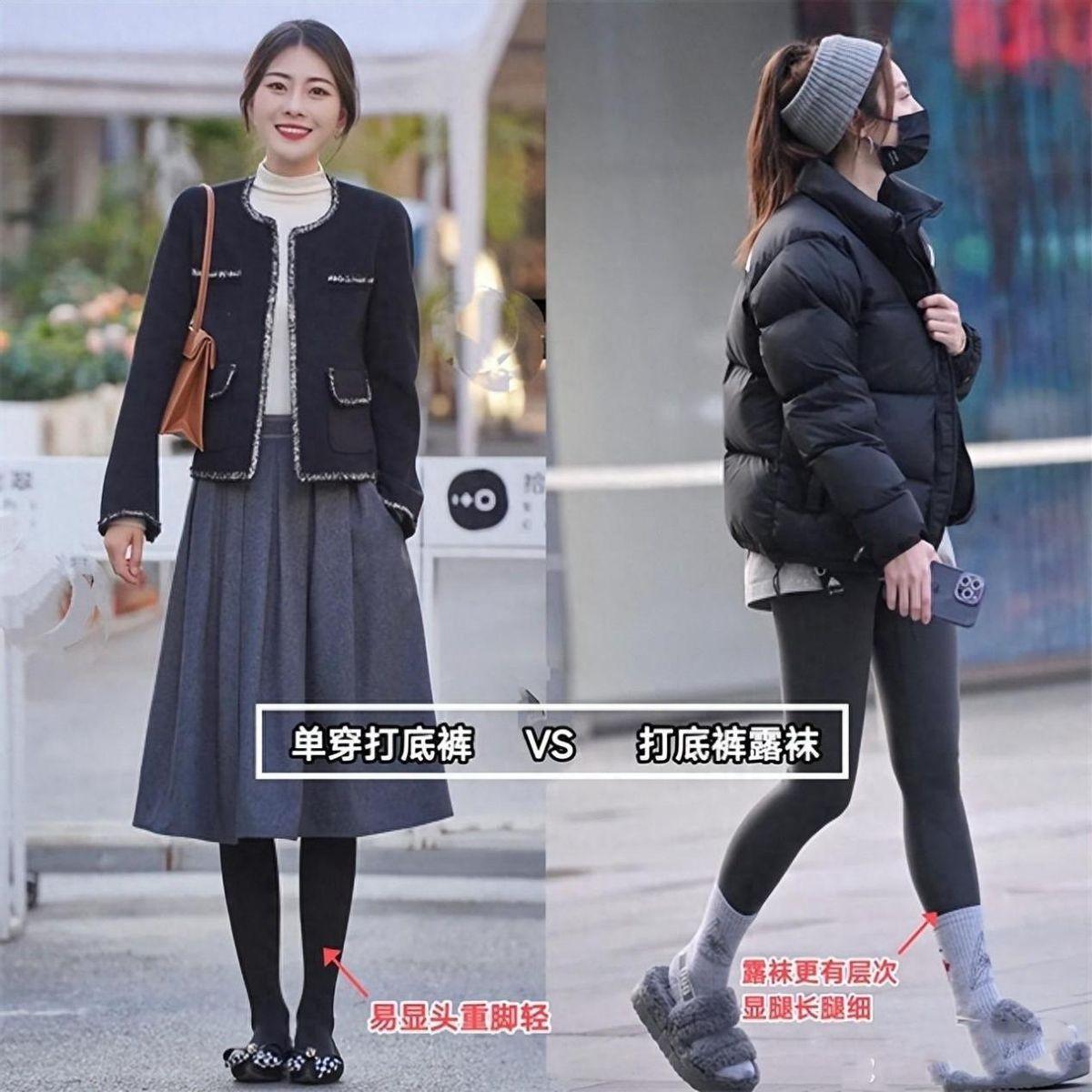 建議大家在搭配打底褲的時候千萬不要直接單穿,否則很容易顯得頭重腳輕,想要讓造型看上去更有層次感,並且穿出顯腿長的效果,可以通過打底褲露襪的穿法。